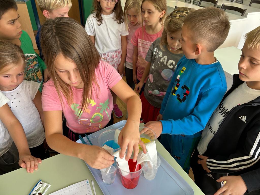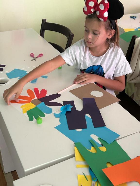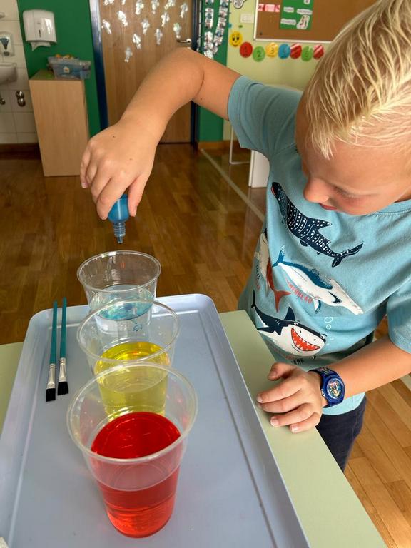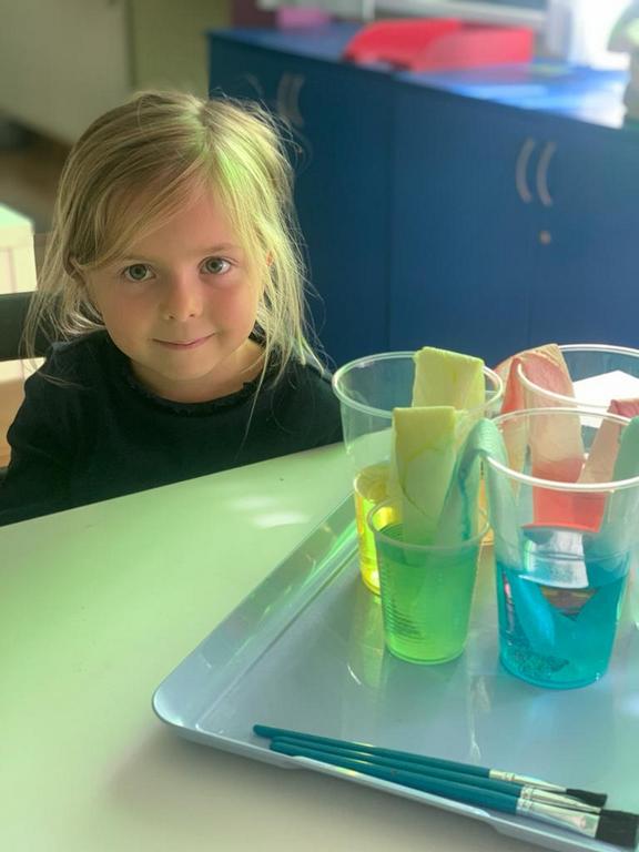 Students begin their color mixing journey by becoming familiar with the primary colors as the building blocks of all other colors: red, blue, and yellow. The color wheel, a rainbow circle, was a fundamental tool for them to understand color mixing and showcasing the relationship between colors.