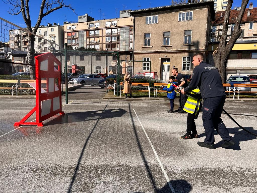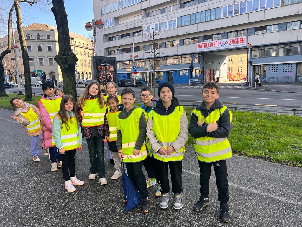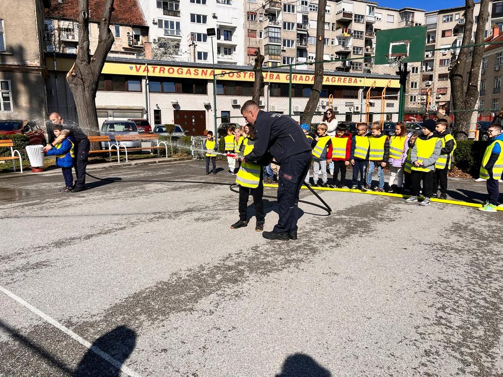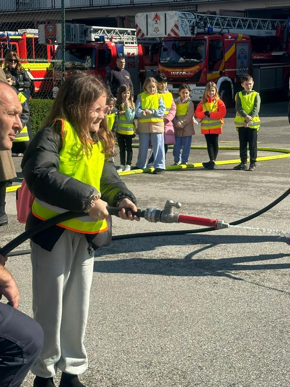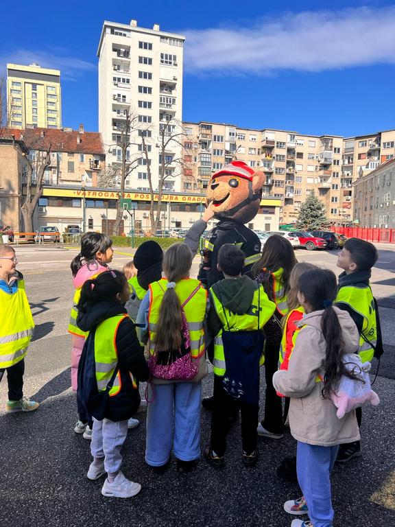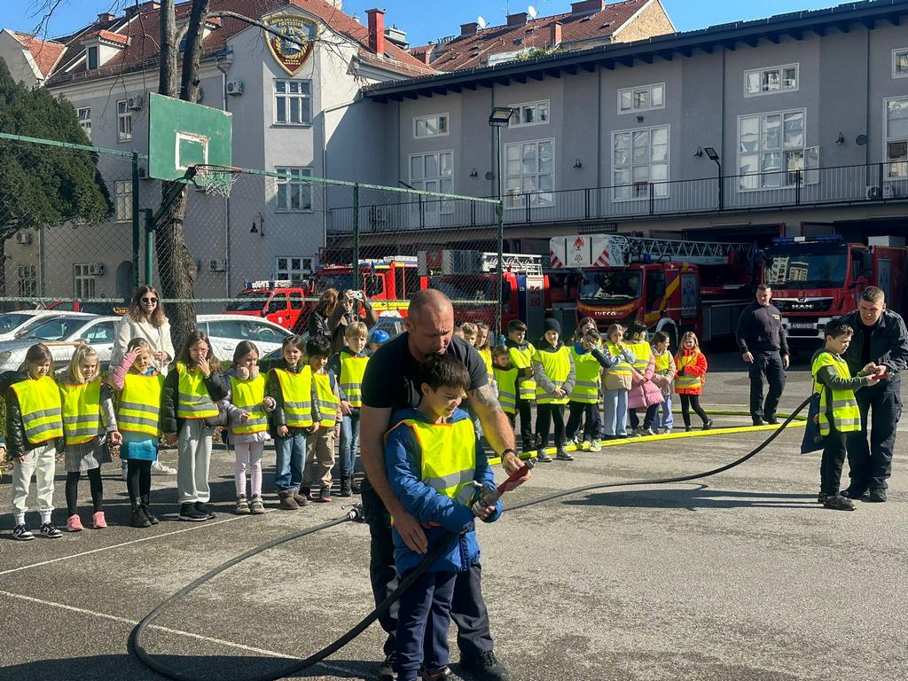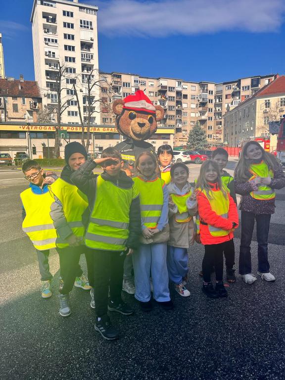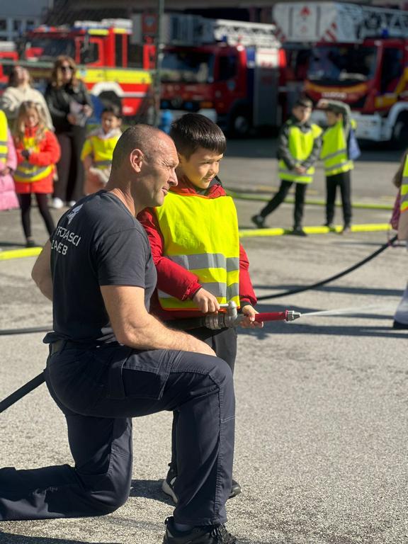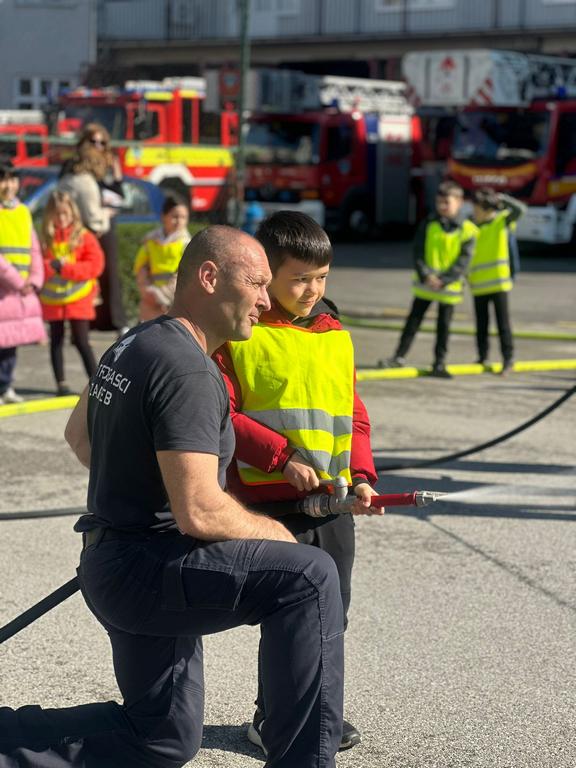 station. We learned about the important gear they use to stay safe, watched a firefighter slide down the pole, and even held the water hose, with the help of the firefighters. We also met the mascot, a bear Brave Hrvoje (Hrabri Hrvoje).
