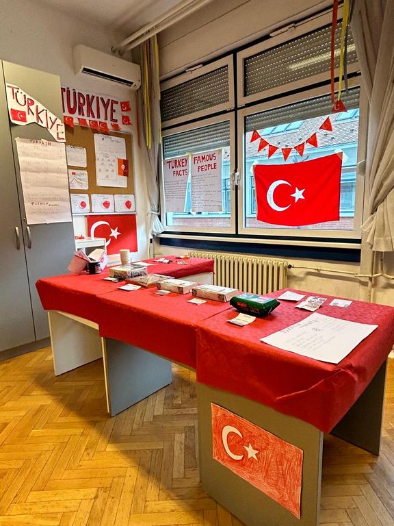 Students then created posters and other handmade crafts such as sculptures made from clay. Petar and Luka A. made several posters about Turkey and brought Baklava for everyone to taste. Goorkem, together with Rafael, presented on Switzerland, and they had plenty of cheese and chocolates to share. Nikol and Katija presented on Croatia and discovered that the whole of Croatia could fit into the city of Kiev, Ukraine.