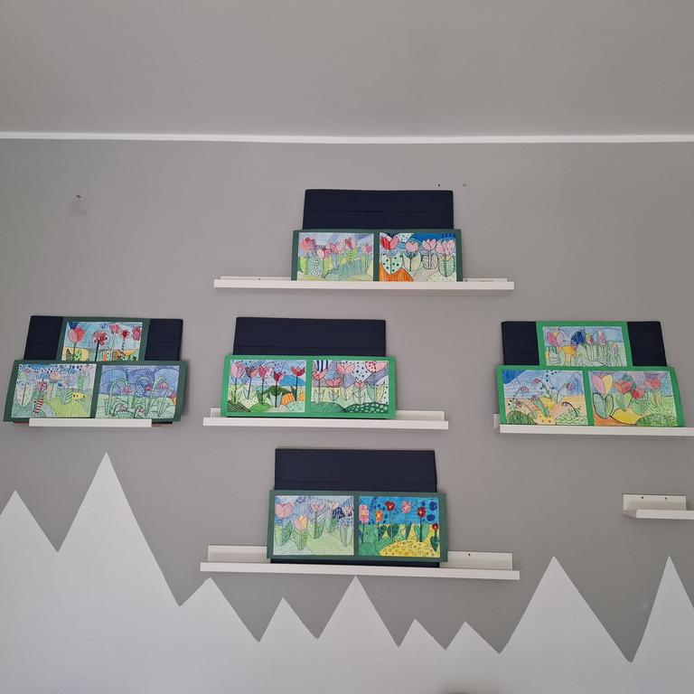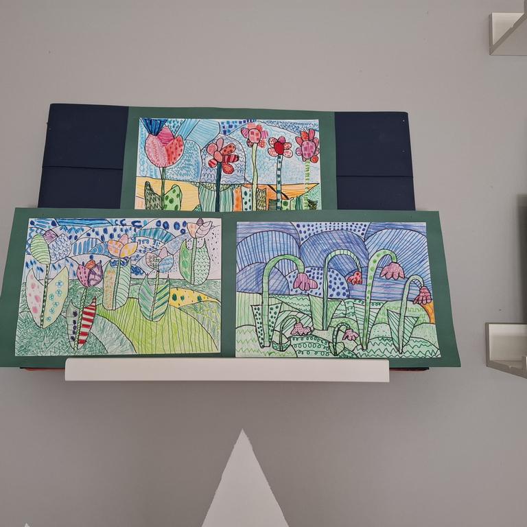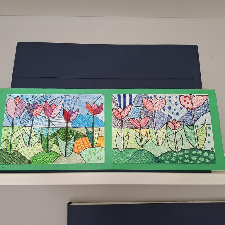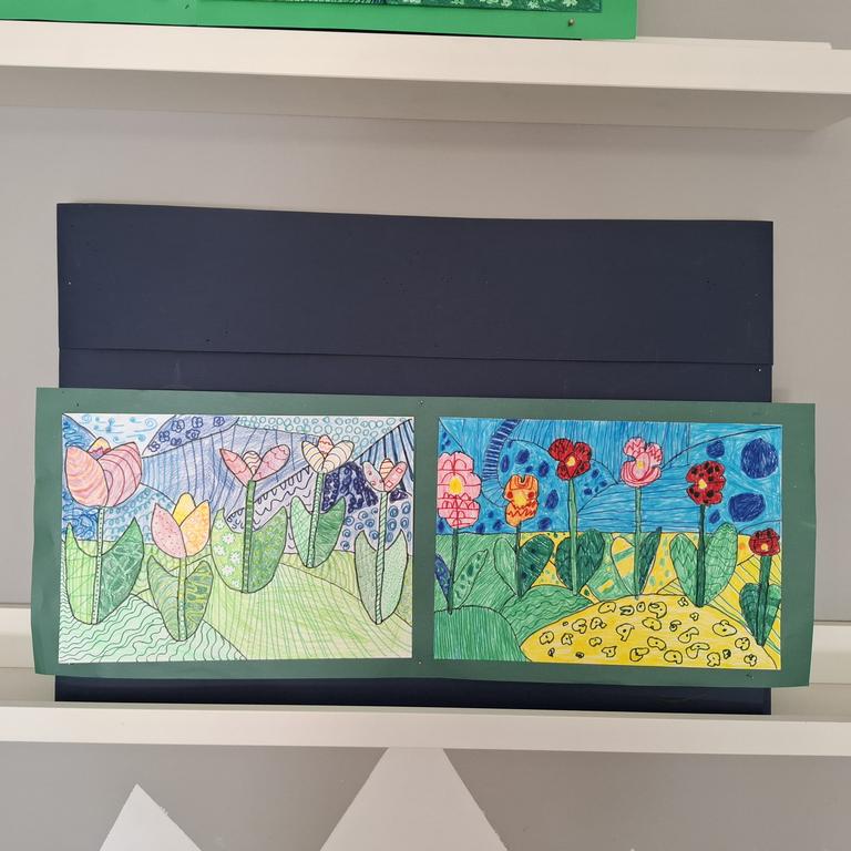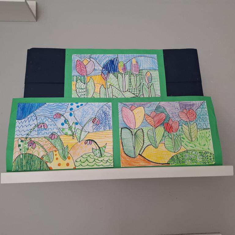 Equally impressive are the spring flowers, beautifully drawn using markers and color pencils. The variety of lines and colors used bring the scene to life with elegance and creativity. Bravo to our young artists for turning simple materials into stunning masterpieces!