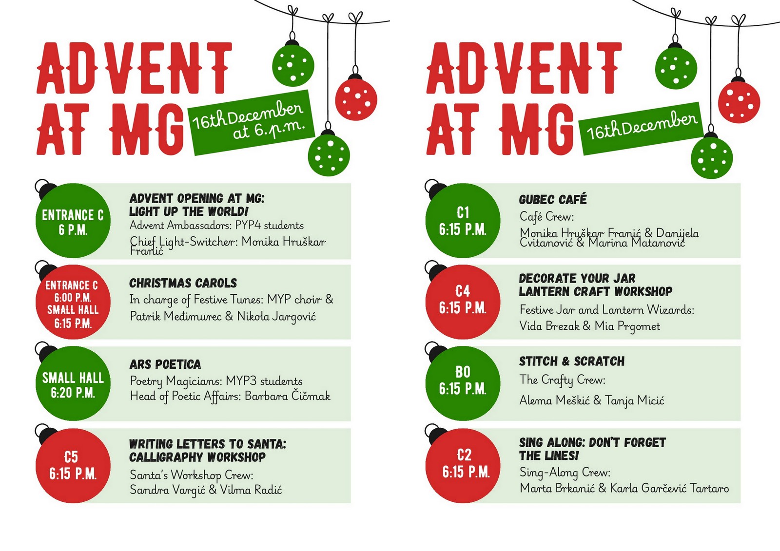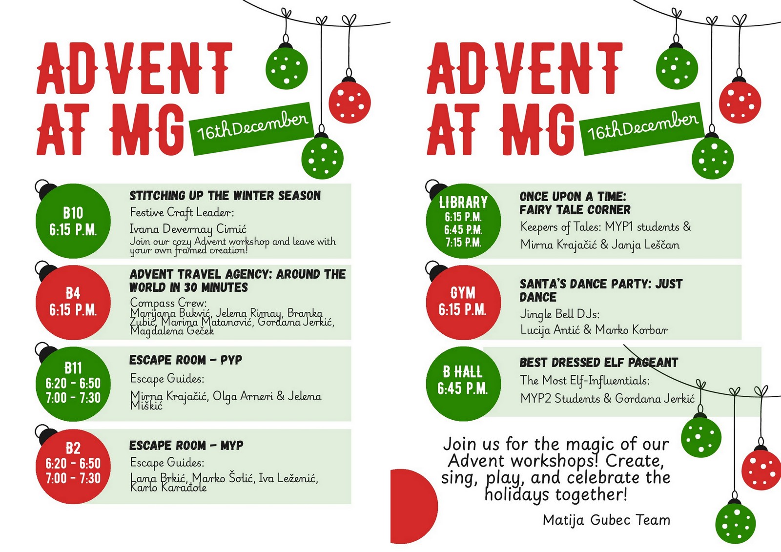 On December 16th, our school came together to celebrate Advent at Gubec, a colourful and joyful event that brought PYP and MYP students, parents, and teachers together in a warm and festive atmosphere. The celebration was filled with creativity, collaboration, and shared moments that truly captured the spirit of the season.