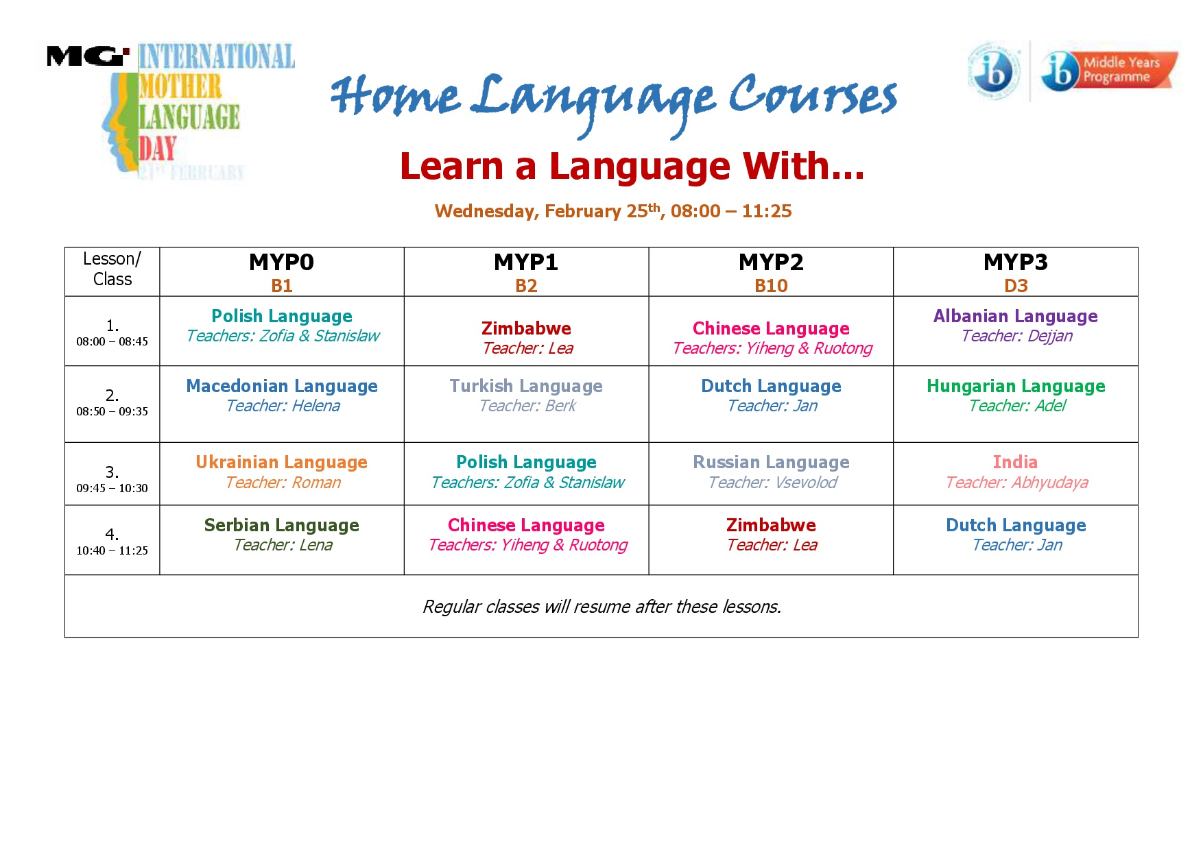 We are grateful to our MYP students – Dejjan, Ruotong & Yiheng, Jan, Adel, Abhyudaya, Helena, Stanislaw & Zofia, Vsevolod, Lena, Berk, Roman and Lea for teaching us the basics of their home languages and sharing valuable insights about their respective countries. The students put in a great deal of effort to prepare their lessons and eagerly took on the role of teachers, highlighting cultural and historical elements such as geography, architecture, literature, music, dance, gastronomy, and many other aspects of their countries.