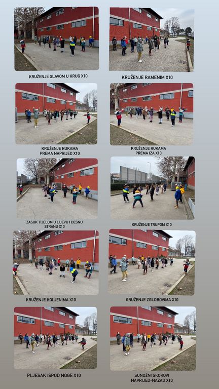 Plesna radionica donijela im je priliku da se upoznaju s različitim plesnim stilovima i izvođačima koji su obilježili posljednjih sto godina. Svaki su stil i sami zaplesali. U školskom dvorištu razgibali smo se izvođenjem 100 pokreta.