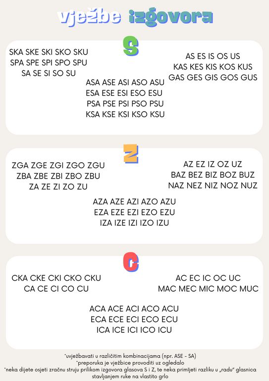 Glasovi mjeseca veljače su glasovi tzv. uže skupine sigmatizma – S, Z i C, a vježbice su u galeriji.