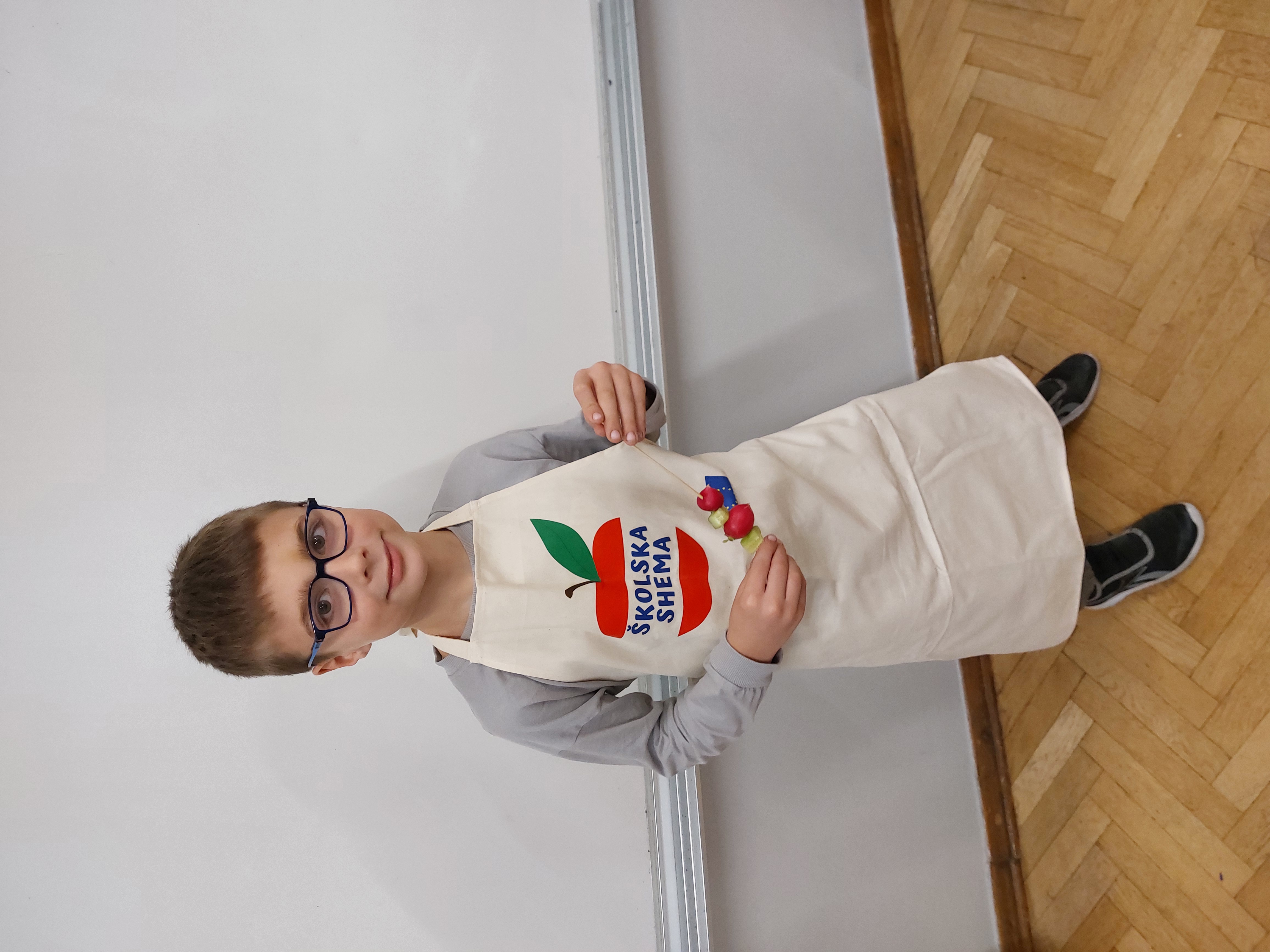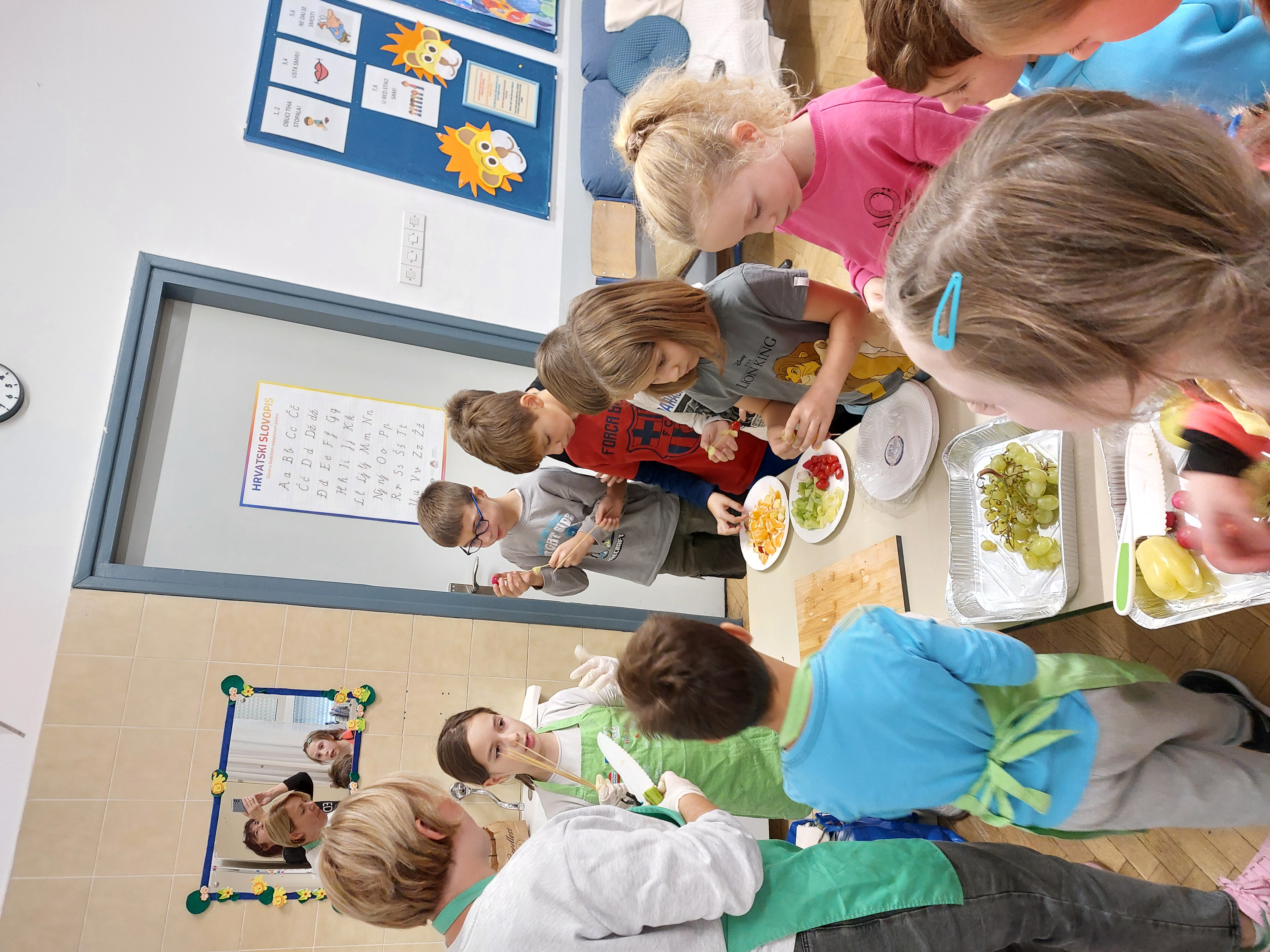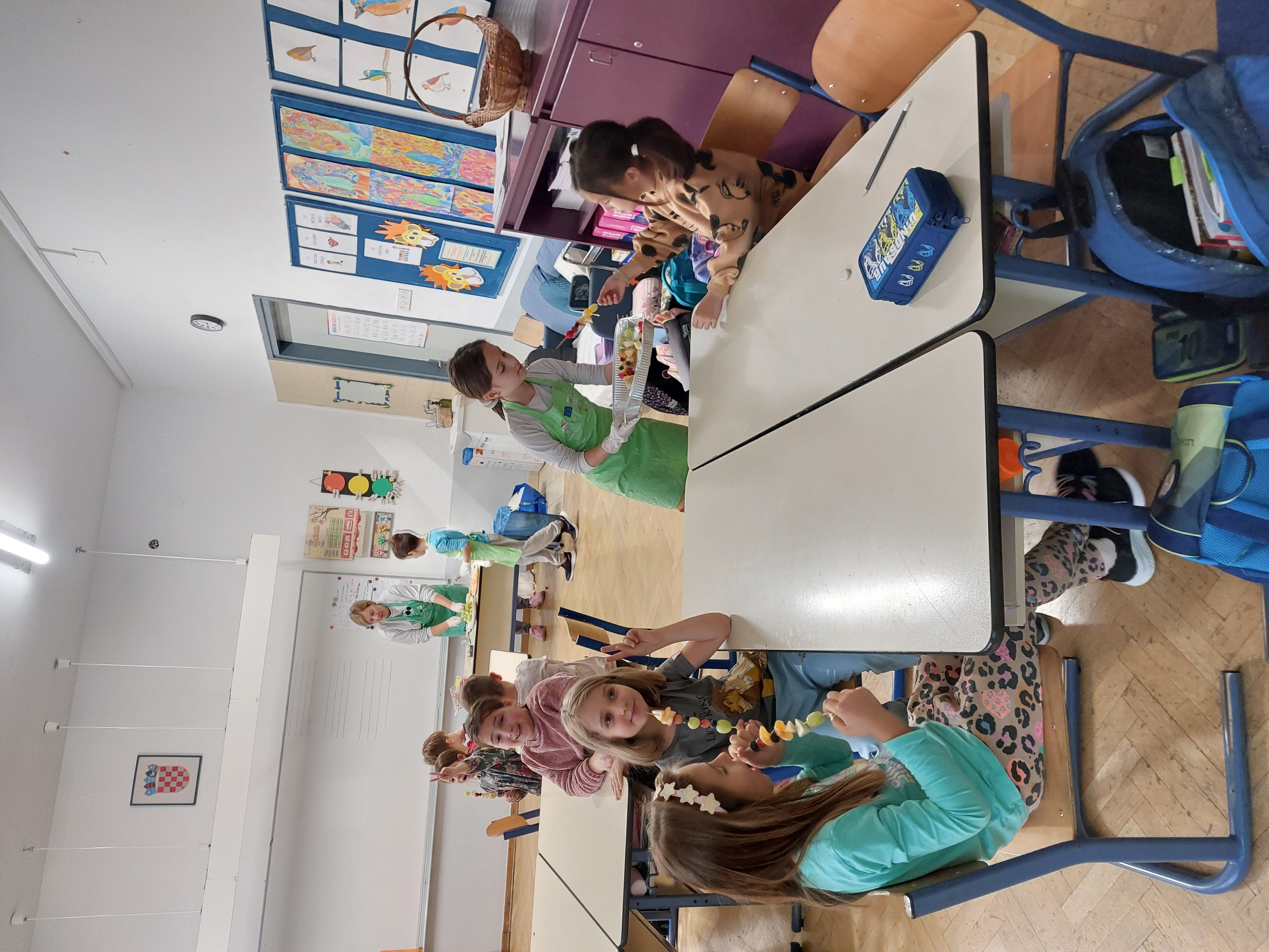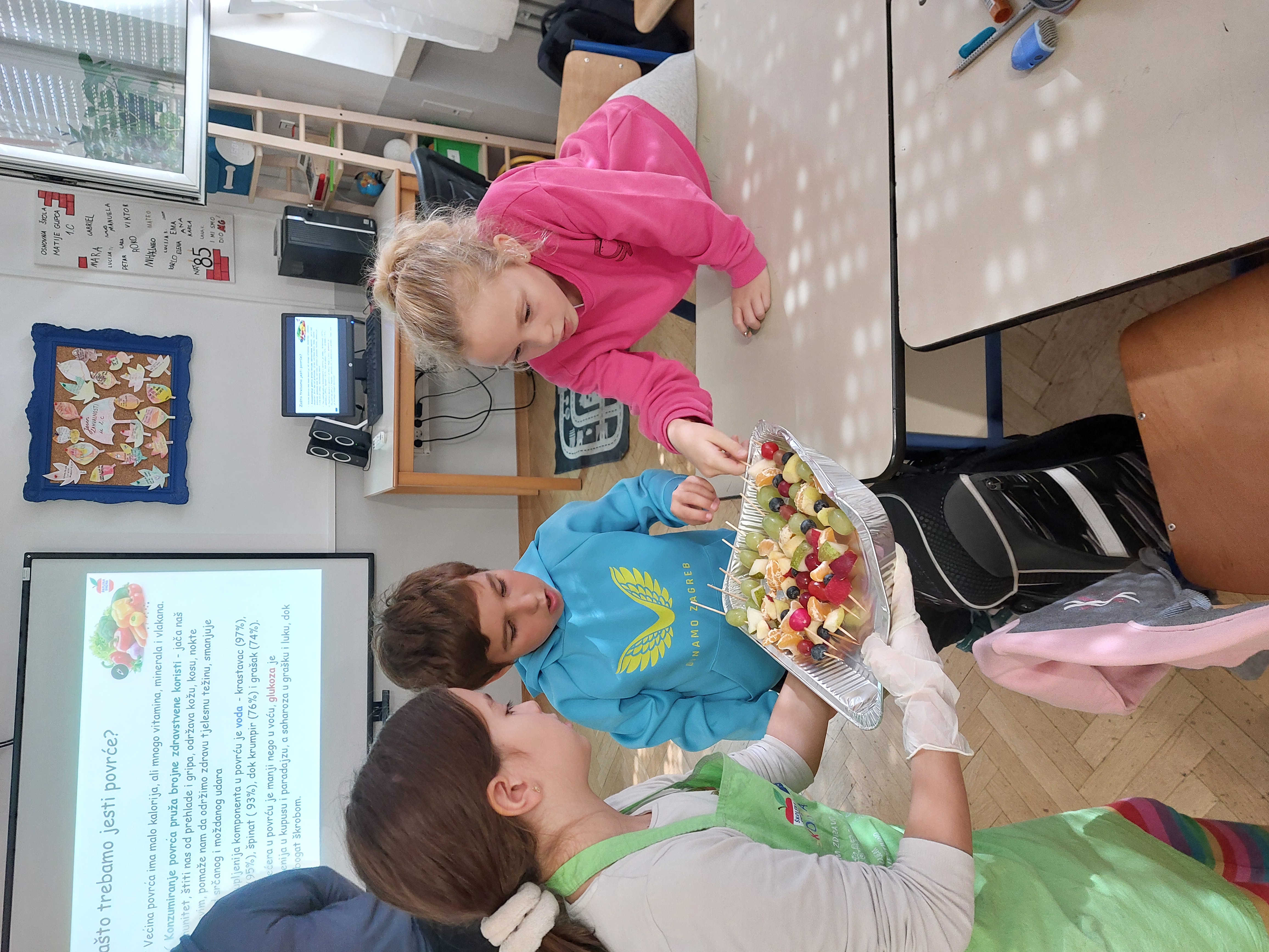 Nakon edukativne prezentacije o važnosti raznovrsne i uravnotežene prehrane, učenici su kušali raznovrsno voće i povrće kombinirano i posloženo u šarene ražnjiće.