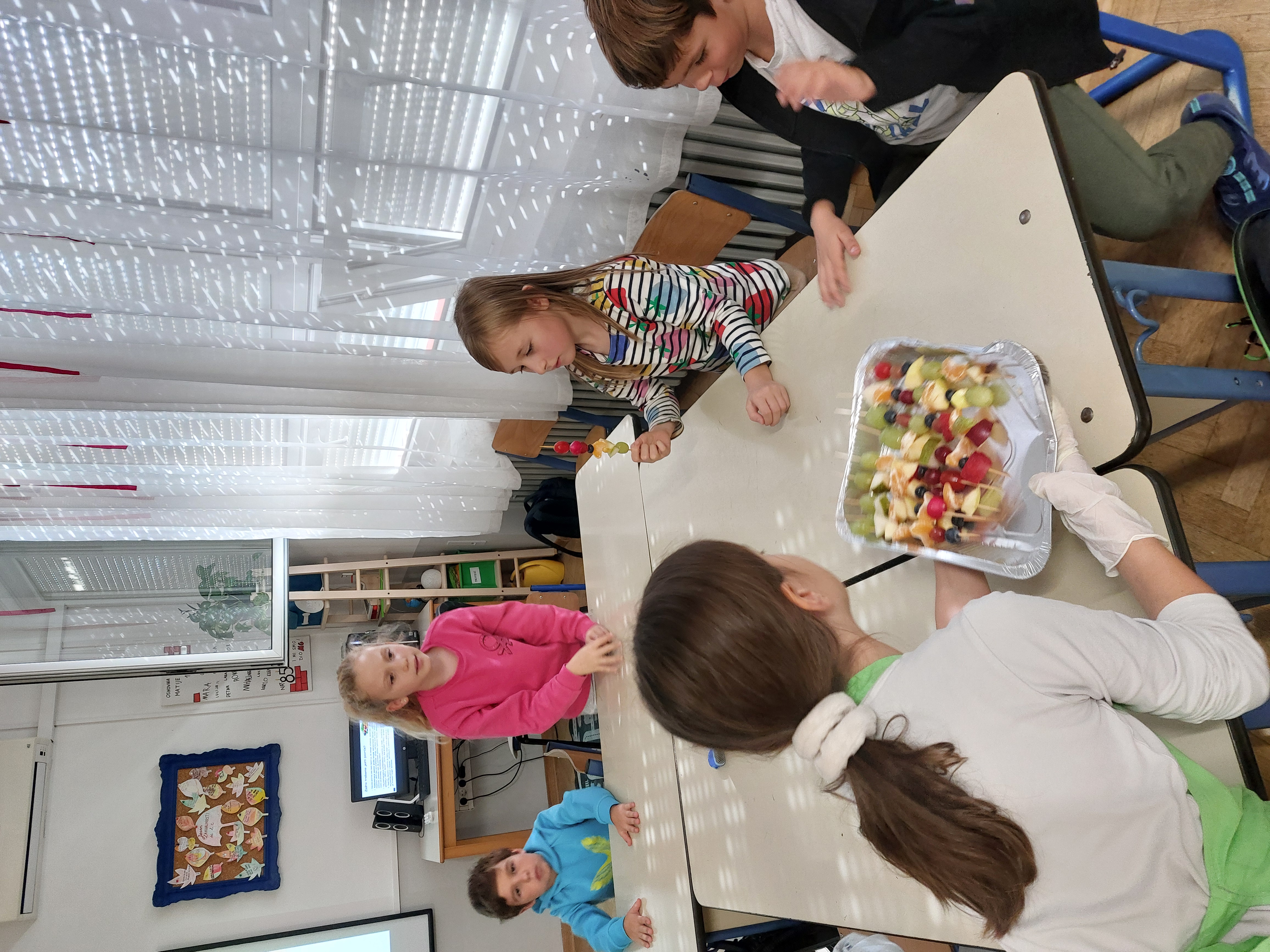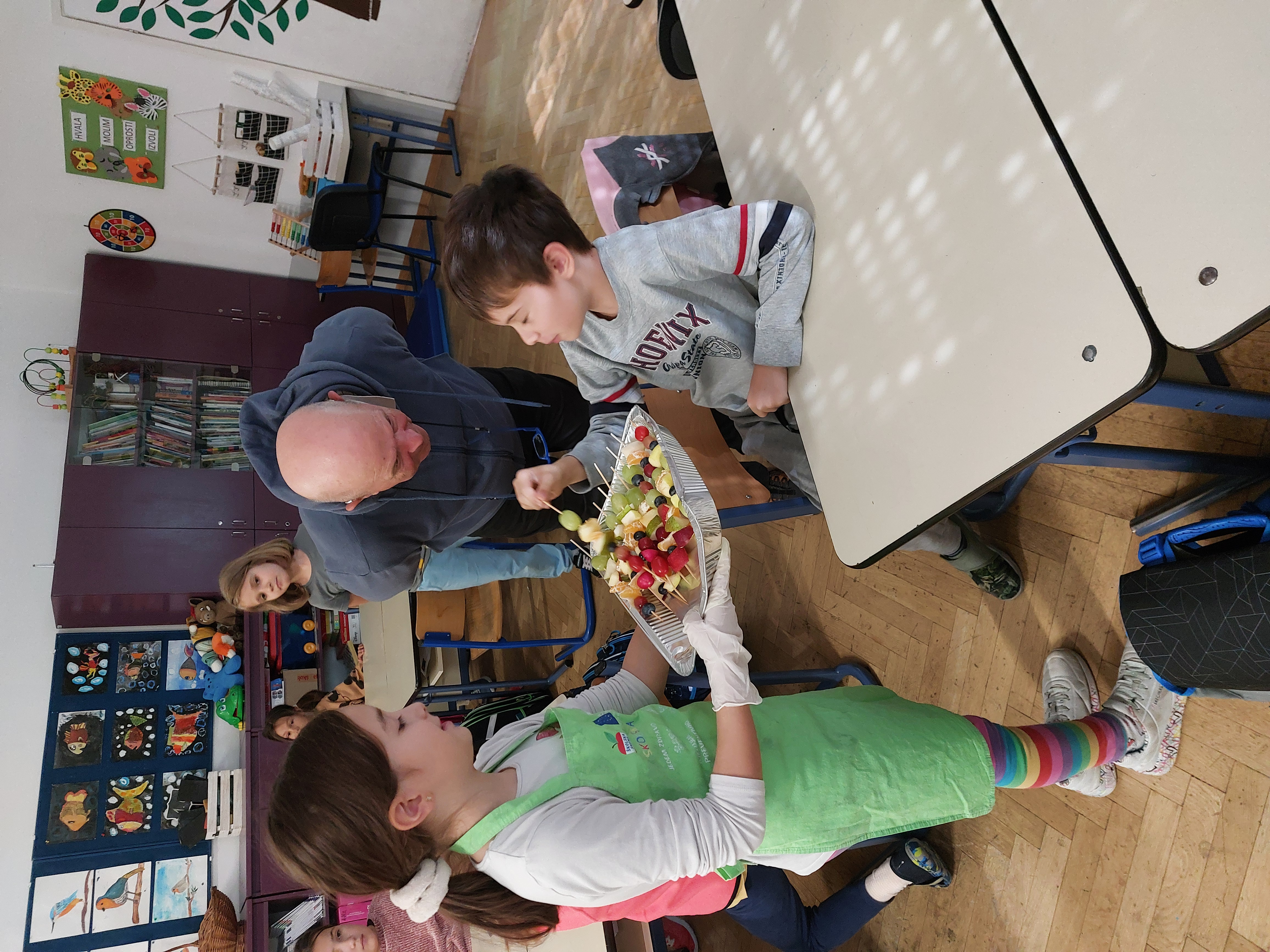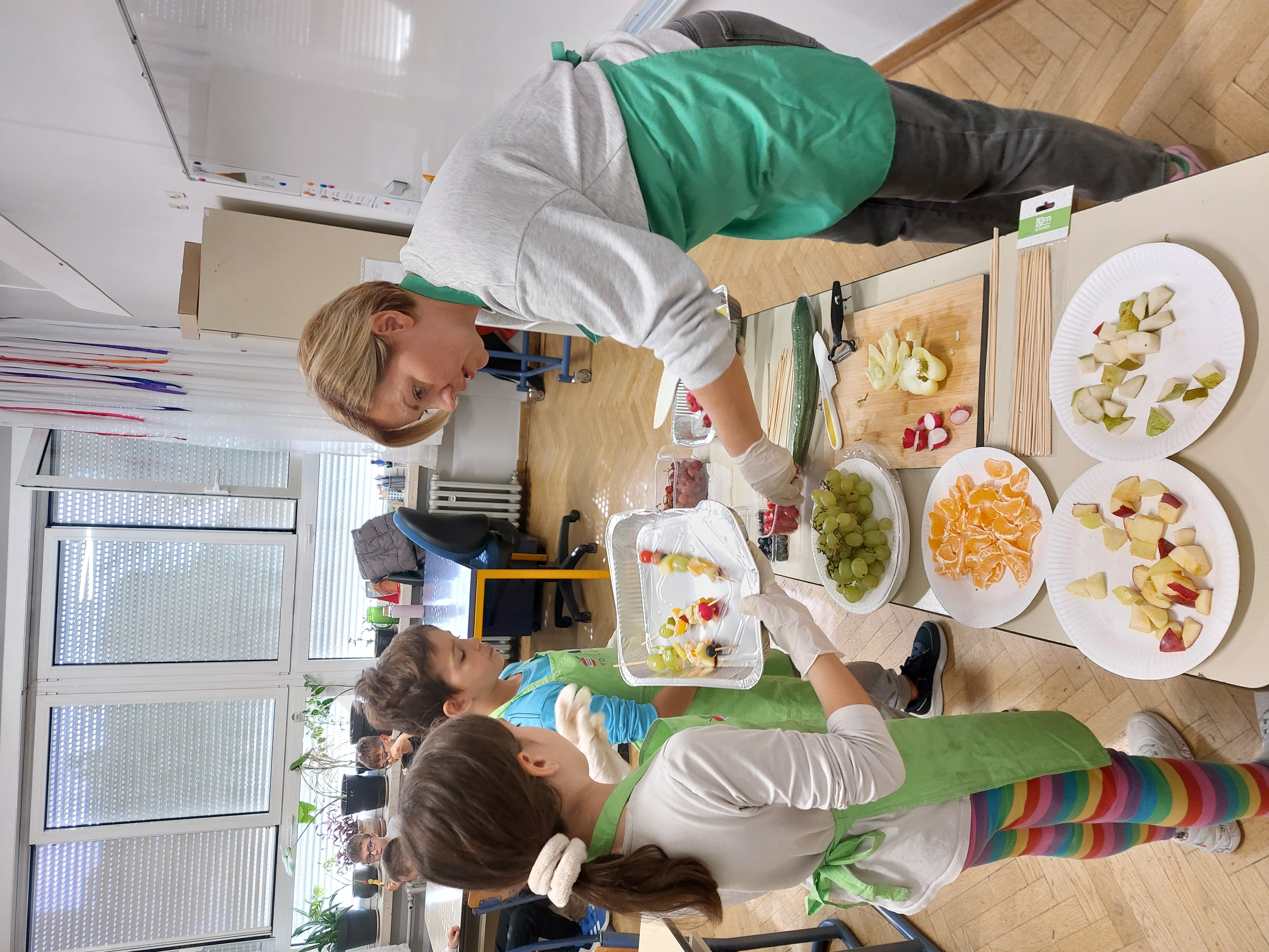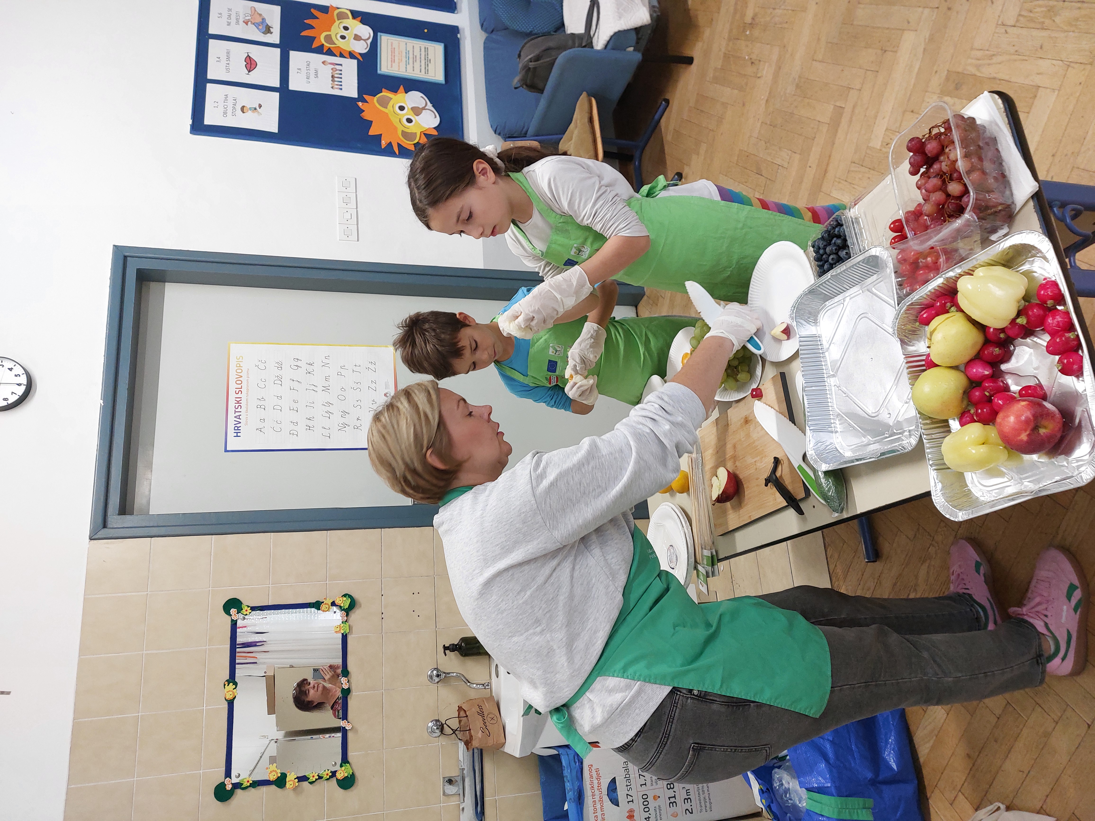 Nakon edukativne prezentacije o važnosti raznovrsne i uravnotežene prehrane, učenici su kušali raznovrsno voće i povrće kombinirano i posloženo u šarene ražnjiće.