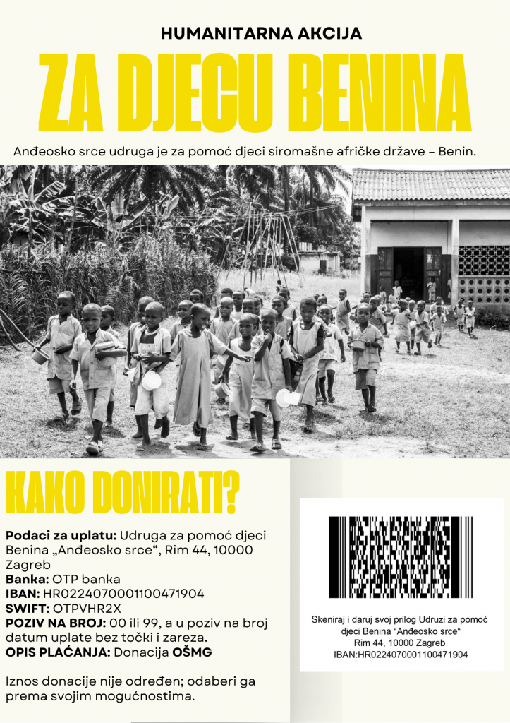 U dogovoru s ravnateljicom škole, pokrenuli smo humanitarnu akciju “Za djecu Benina”, s ciljem prikupljanja novčanih donacija koje će biti izravno proslijeđene djeci u sirotištu putem udruge Anđeosko srce.