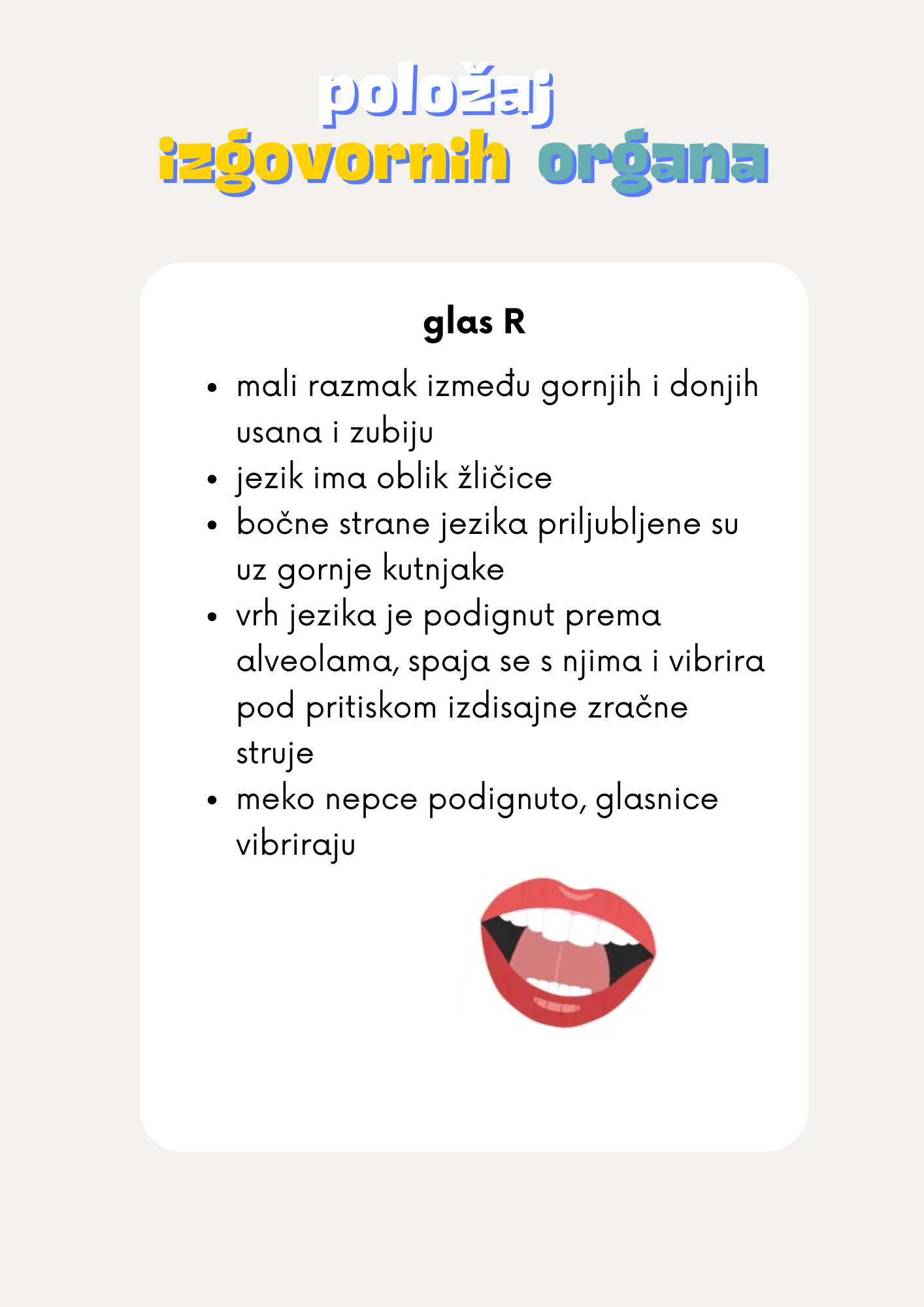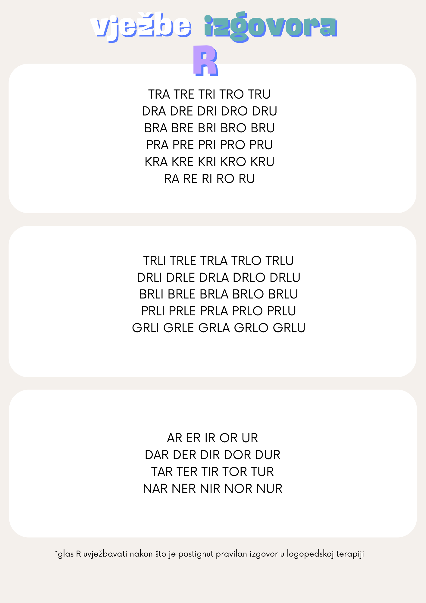 Ponavljamo da je prije samog uvježbavanja izgovora, nužno je da dijete pojedini glas uočava i razlikuje od ostalih, da provodi artikulacijsku gimnastiku te da poznaje i može uspostaviti pravilan položaj izgovornih organa.
