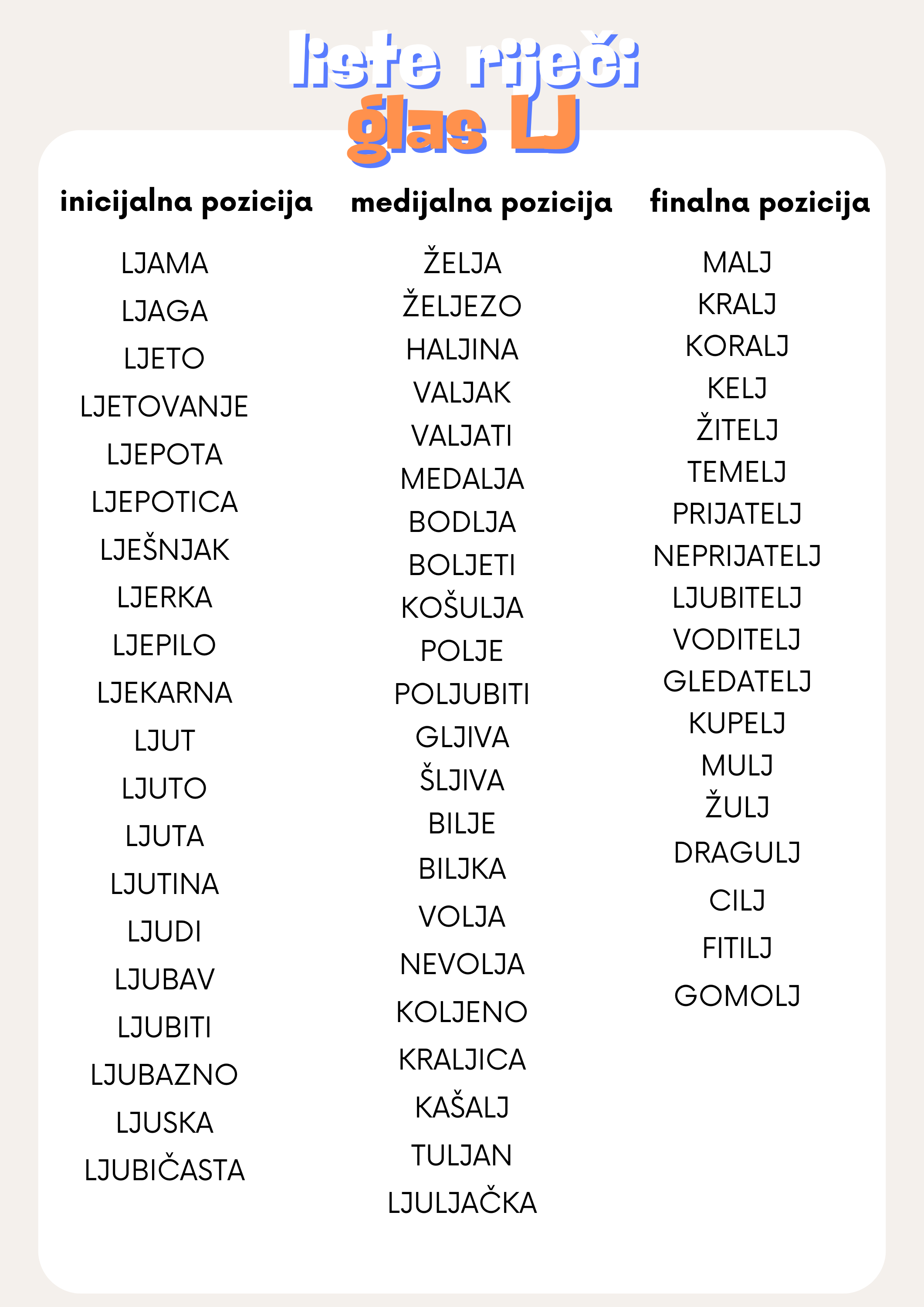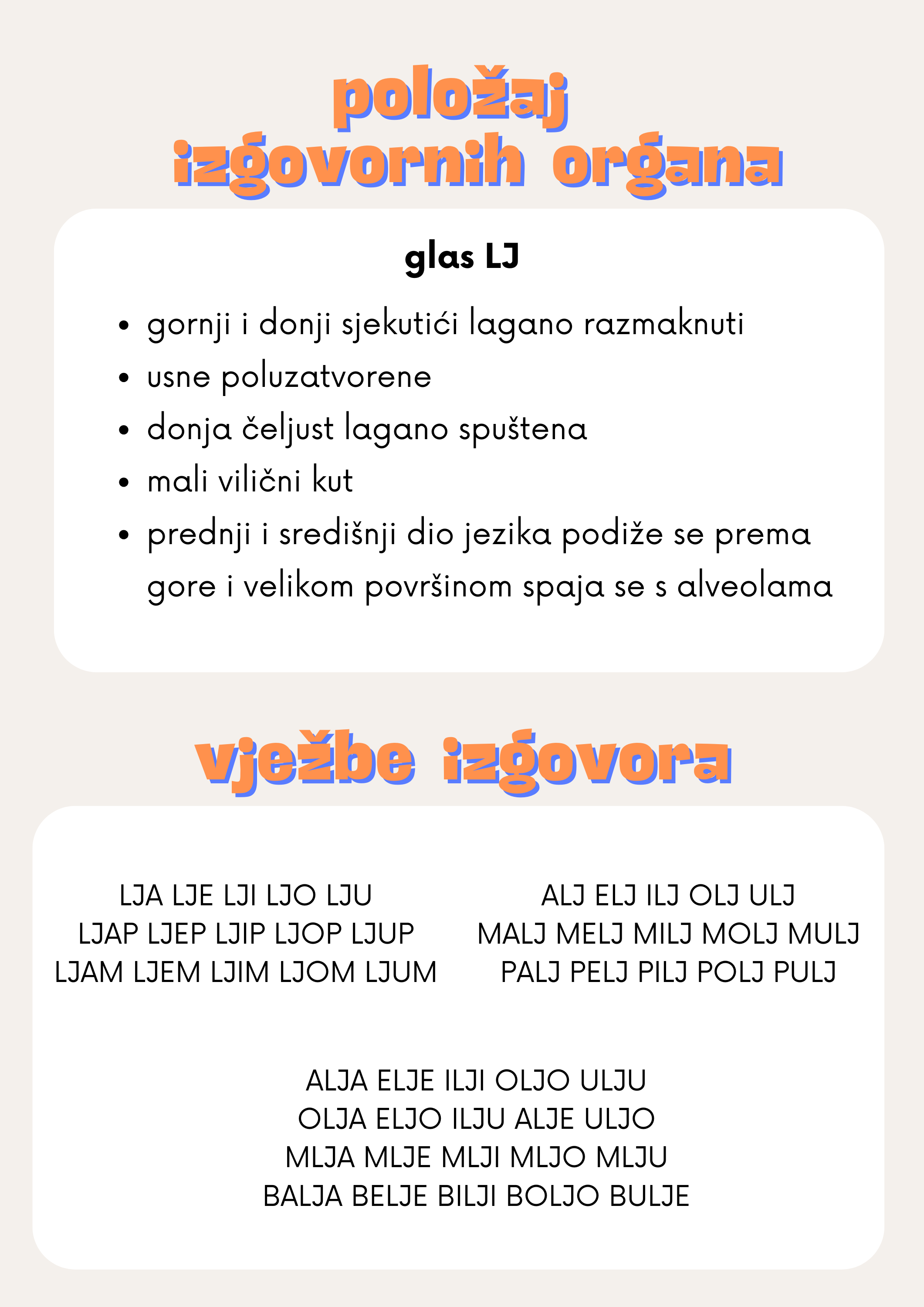 Posljednji glas u seriji Glas mjeseca je LJ. Preduvjet za korekciju izgovora glasa LJ je pravilno izgovaranje glasa L.