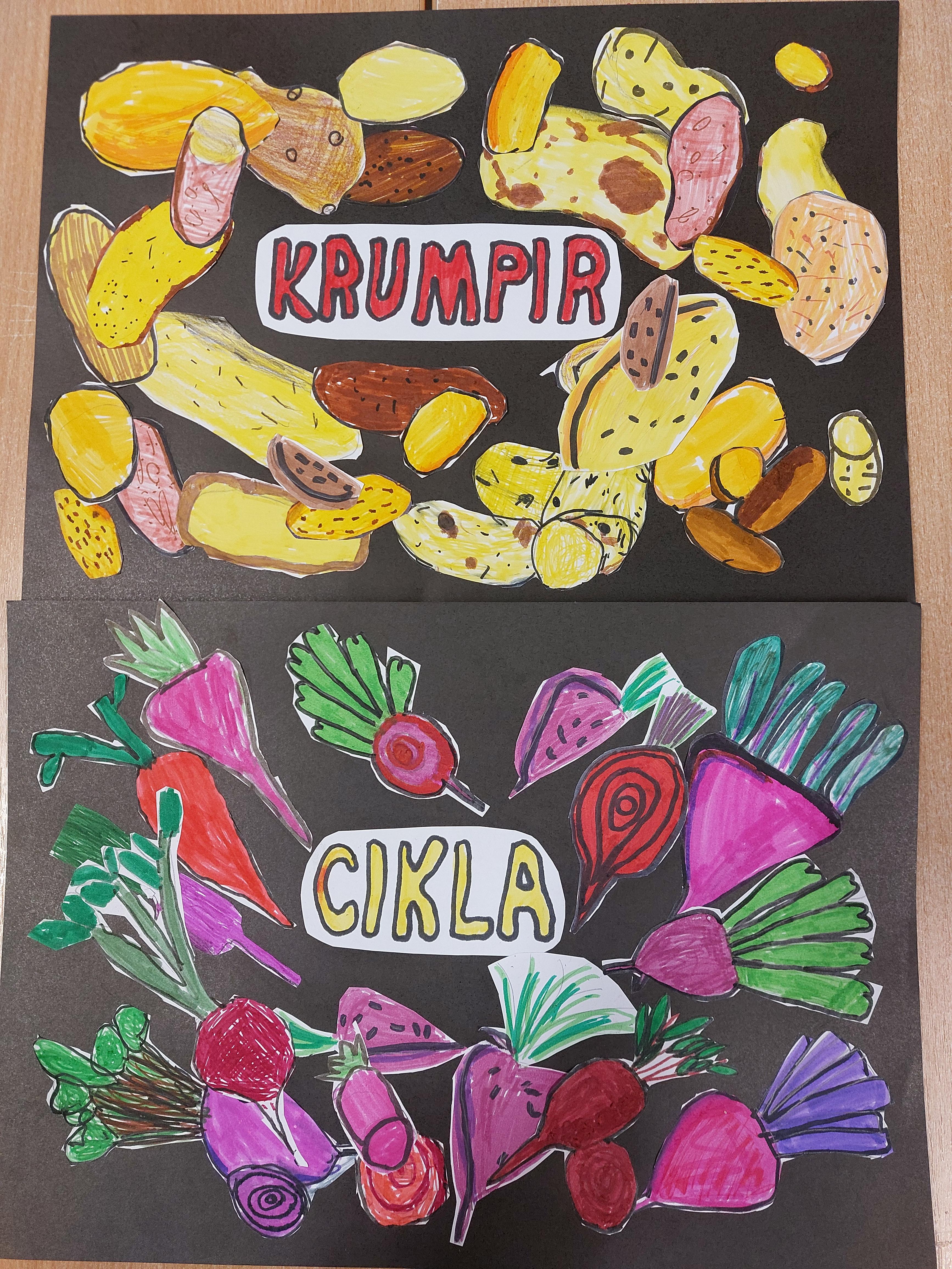 U veljači je došao red na naš razred. U produženom boravku 2. b razreda smo istražili nutritivne vrijednosti krumpira i cikle kao namirnice mjeseca te raznovrsna jela koja se od njih mogu pripremiti. Svaki je učenik izradio svoju sličicu povrća koju smo ujedinili u mali zajednički plakat.