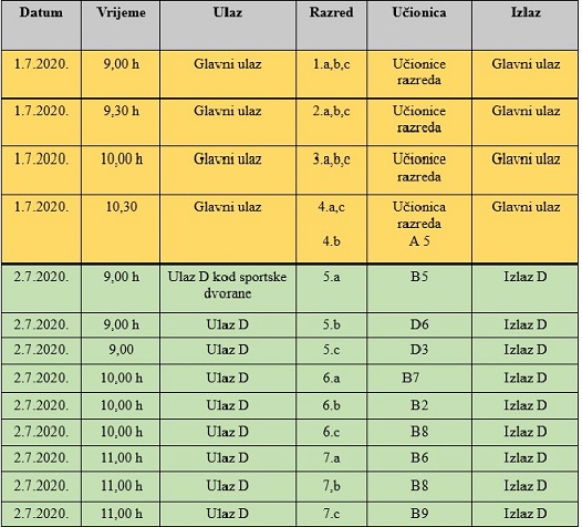 RASPORED DOLAZAKA UČENIKA KOJI ŽELE PREUZETI SVJEDODŽBU U SRPNJU
