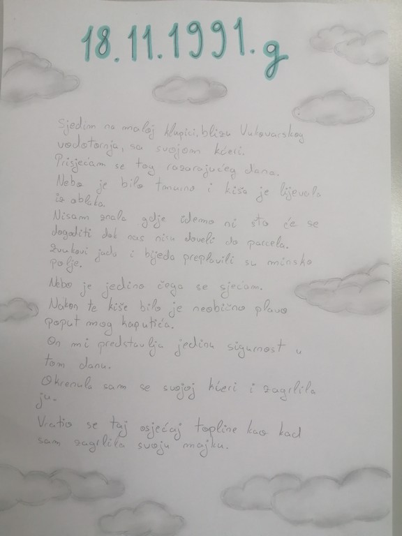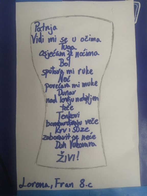 Učenici su se upoznali sa stradanjima hrvatskih vojnika, civila i djece tih teških dana kroz simbole koji nas podsjećaju na borbu za hrvatsku slobodu i neovisnost: vukovarski vodotoranj, plavi kaputić koji je nosila djevojčica Željka Jurić izlazeći u koloni iz razrušenog Vukovara, priče i pjesme koje su ostale podsjetnici na Domovinski rat.