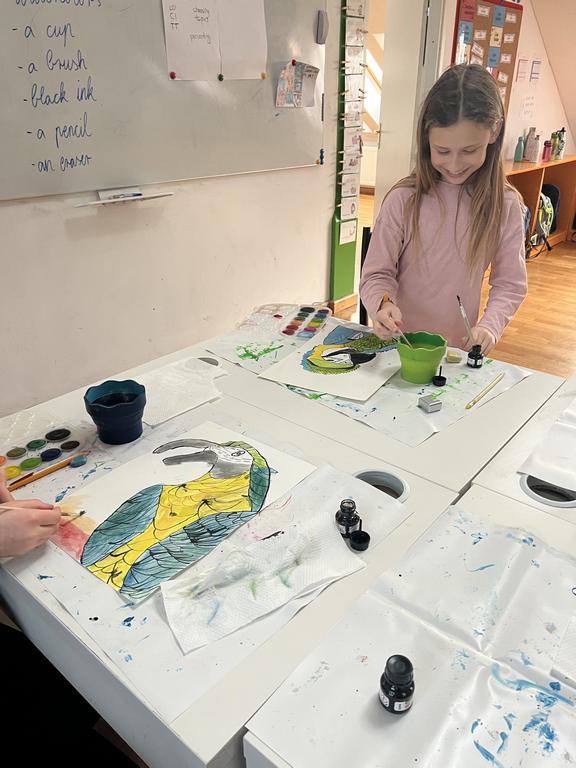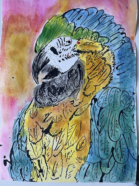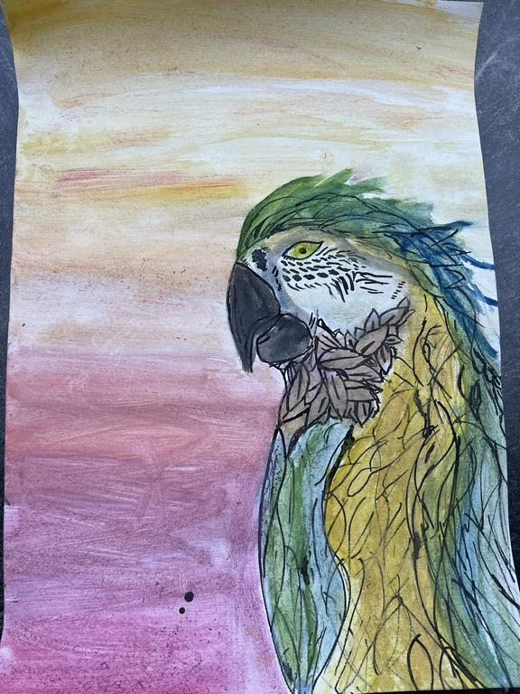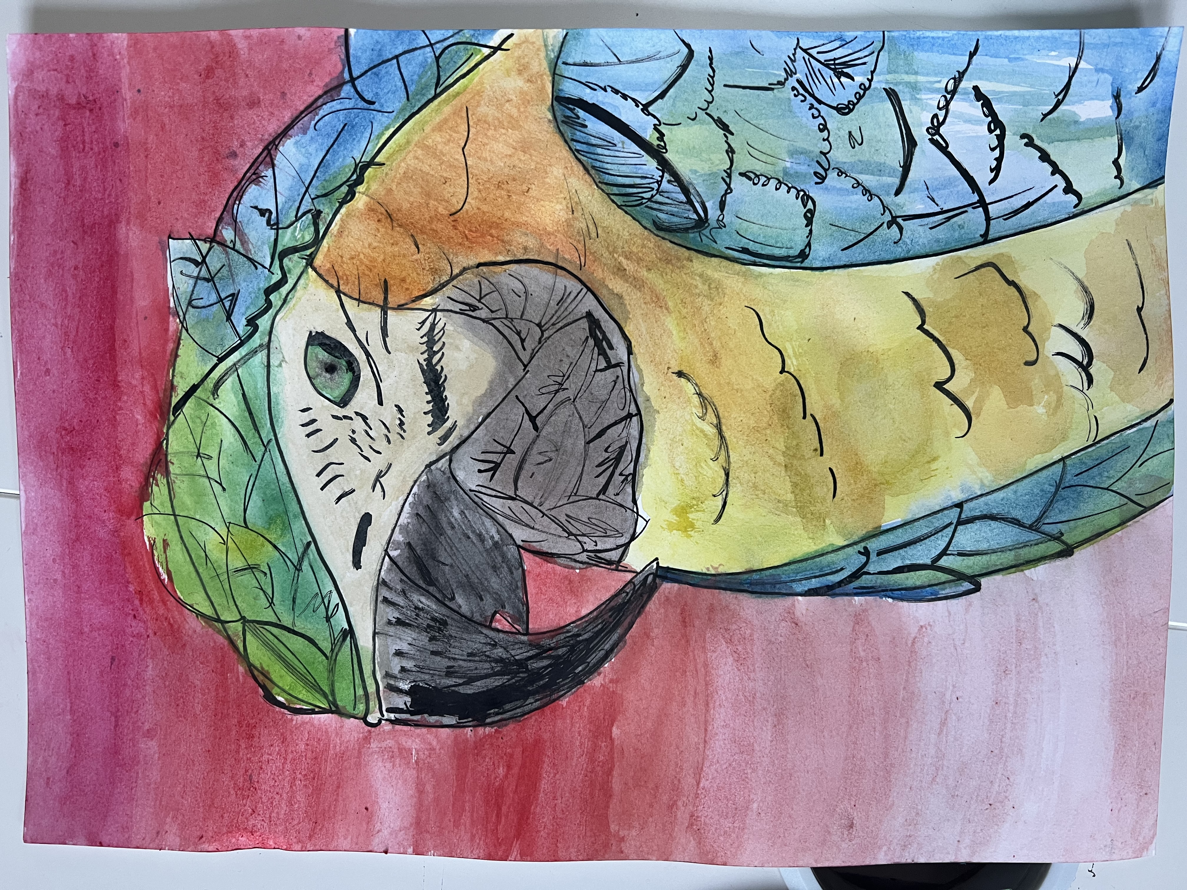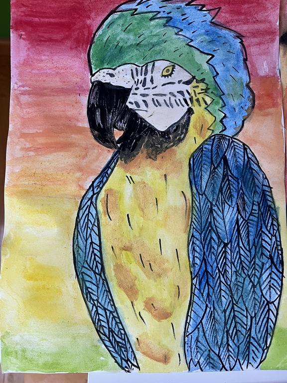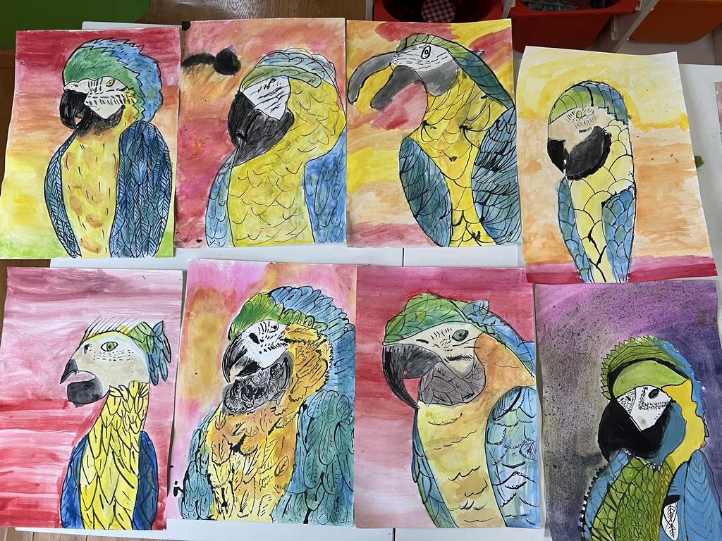 Hence, we drew and painted some beautiful, majestic parrots in color contrast.