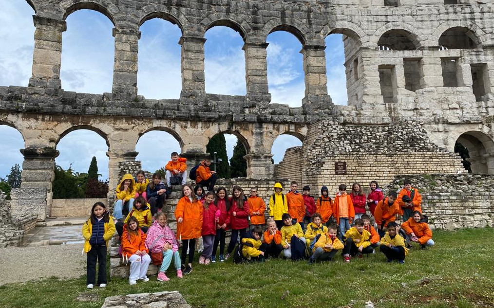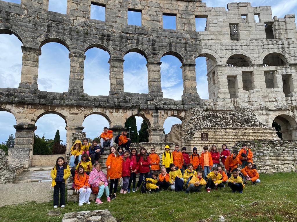 On the second day, we woke up and ate breakfast. After breakfast, we went to the city called Pula. We visited the Amphitheatre and bought some souvenirs for our families. We got caught in heavy rain. Once we came back we had lunch and rested after. We went to dinner and then to the pool, in the night we watched a soccer match.