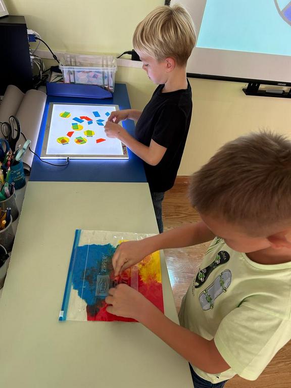 But here's the cool part: mixing colors isn't just for art. Students found out that colors are also in science, math, music, and games. They discovered how colors interact through the absorption and reflection of light. They were composing their patterns by mixing different shapes and colors to notate rhythmical body percussion beats.