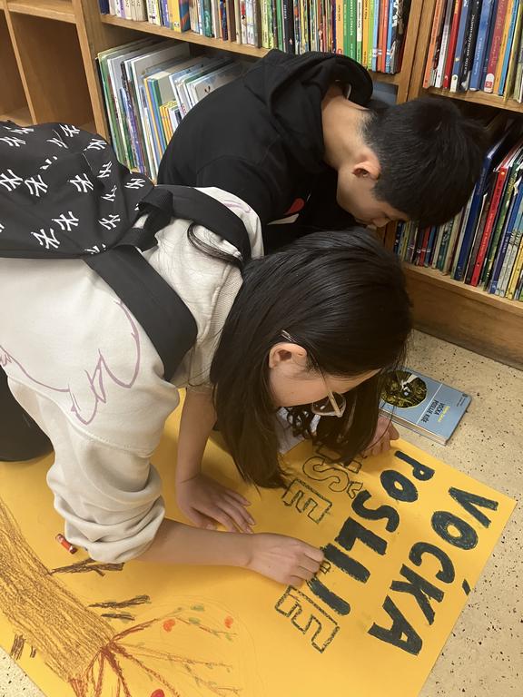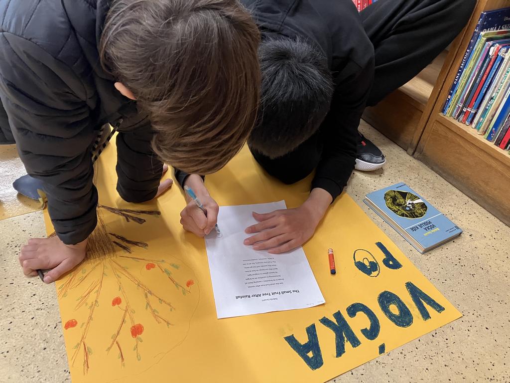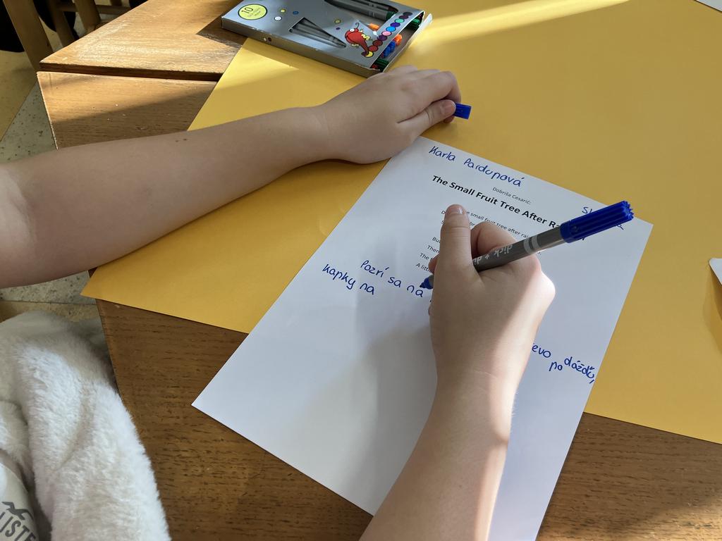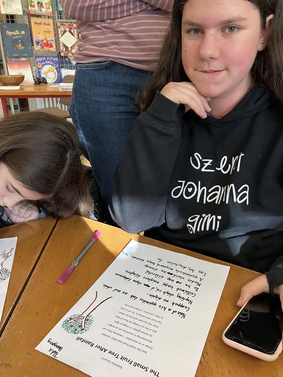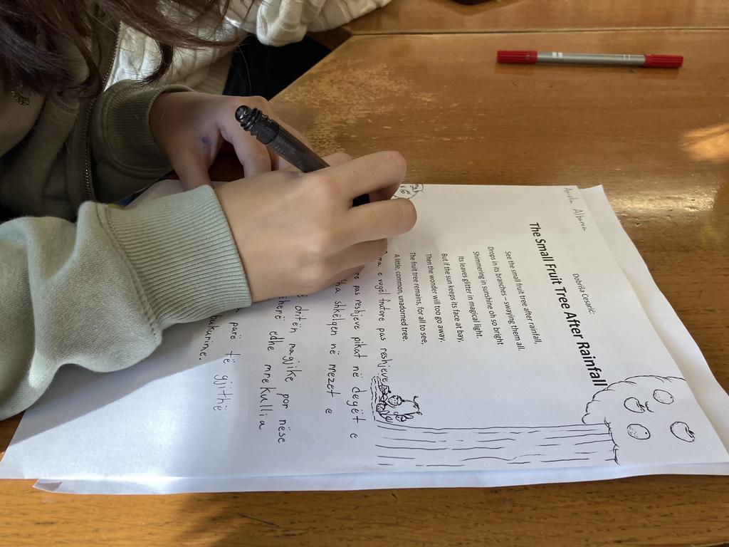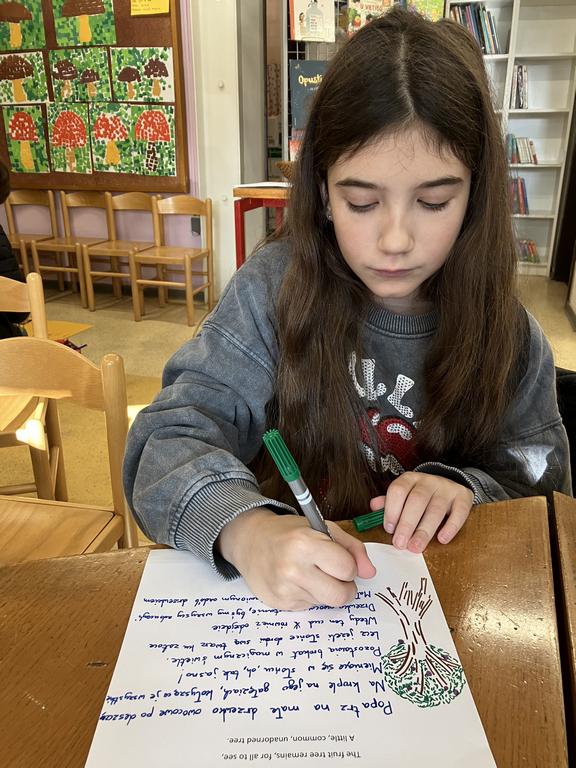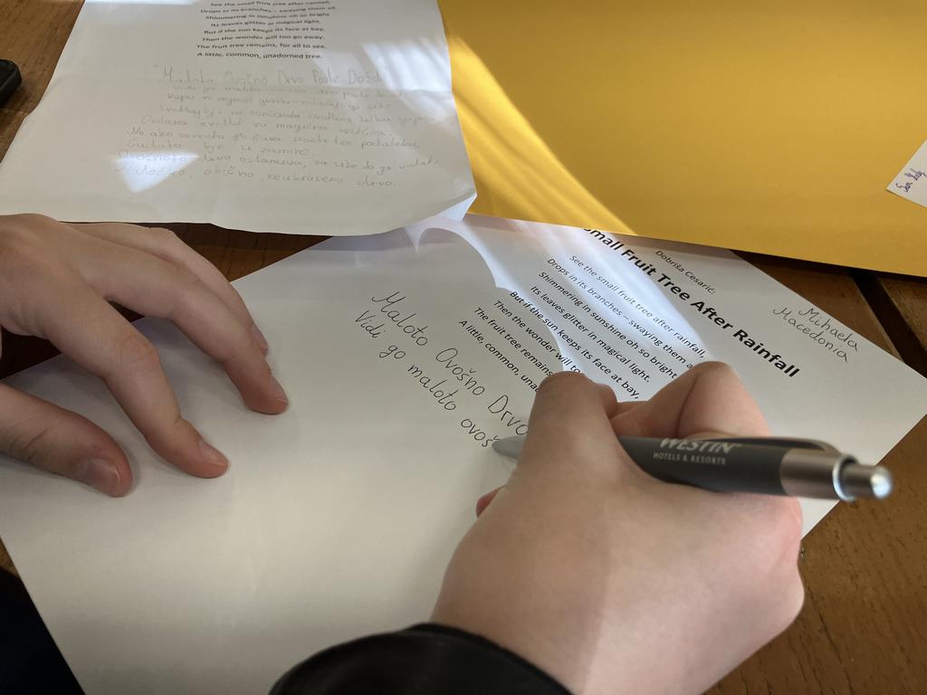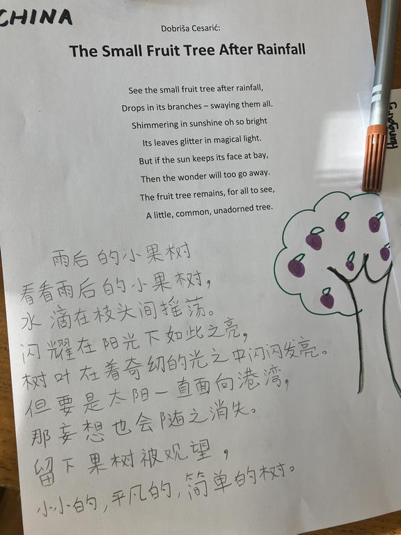 After reading the original in Croatian, from an autor signed book, the students translated well-known Dobrisa Cesaric's poem The Small Fruit Tree After Rainfall (Voćka poslije kiše) in 7 of their mother languages - Albanian, Chinese, Hungarian, Italian, Macedonian, Polish and Slovak. Some of them were even brave enough to read their translations out loud and all the translations are presented on a poster in our school library.