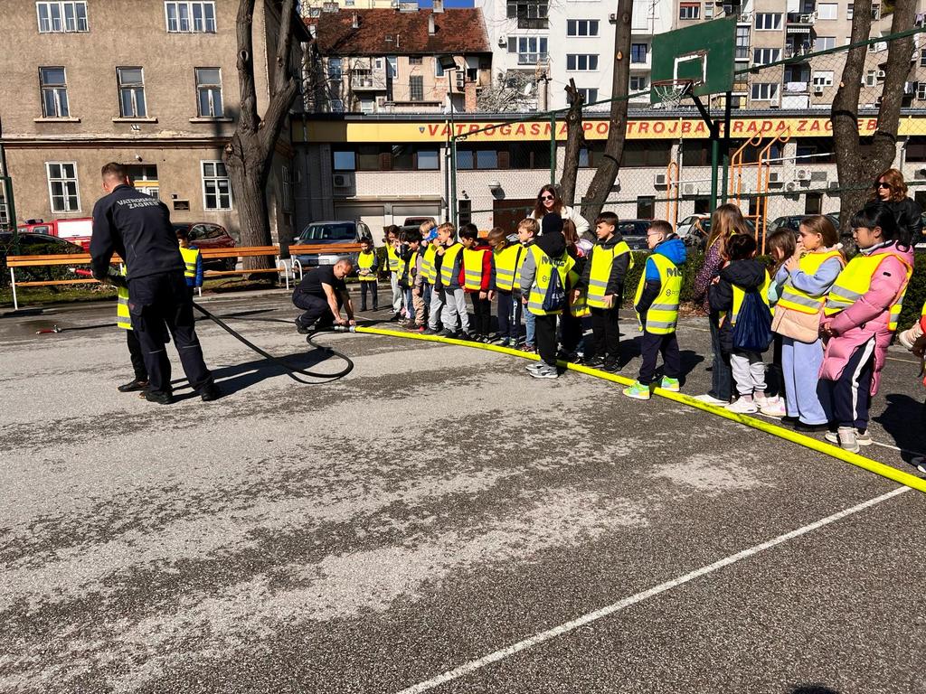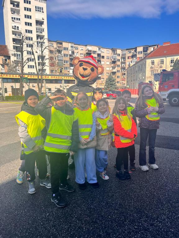 station. We learned about the important gear they use to stay safe, watched a firefighter slide down the pole, and even held the water hose, with the help of the firefighters. We also met the mascot, a bear Brave Hrvoje (Hrabri Hrvoje).