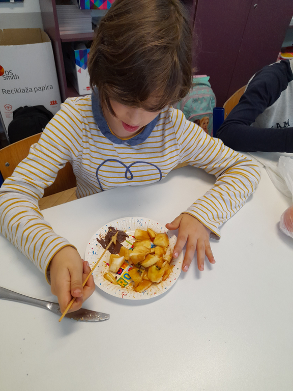 Radili smo ražnjiće od jabuka koje smo umočili u čokoladu. Iako to učenici nisu nikada probali, jako im se svidjelo.