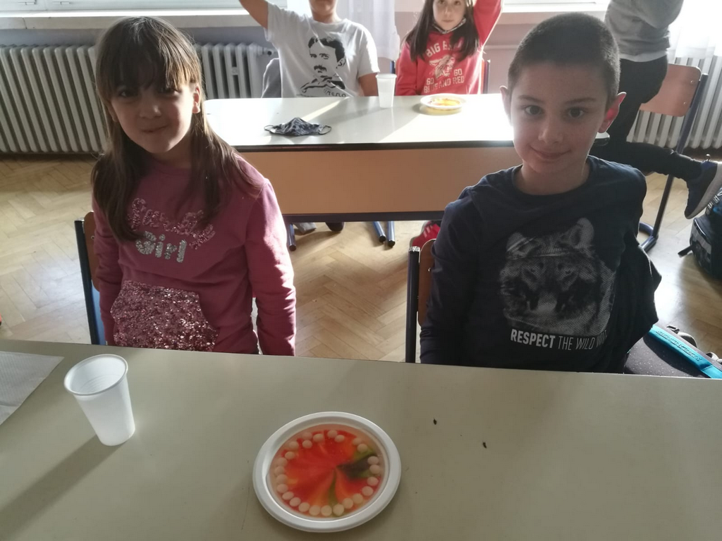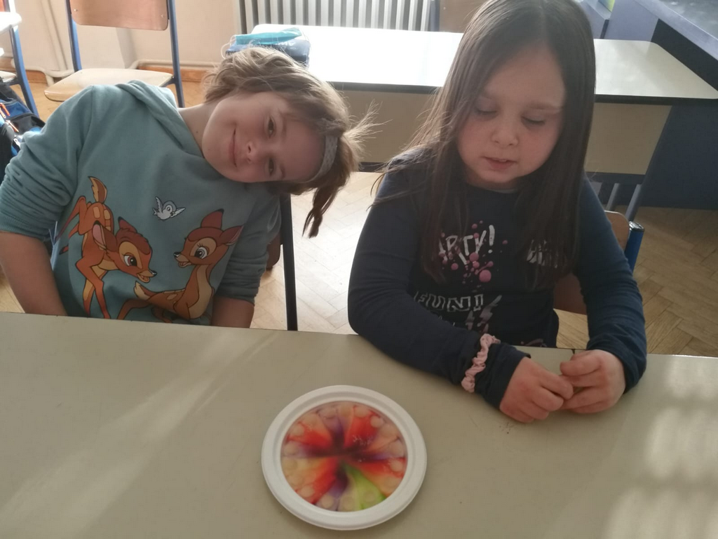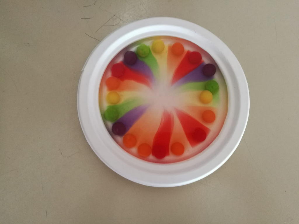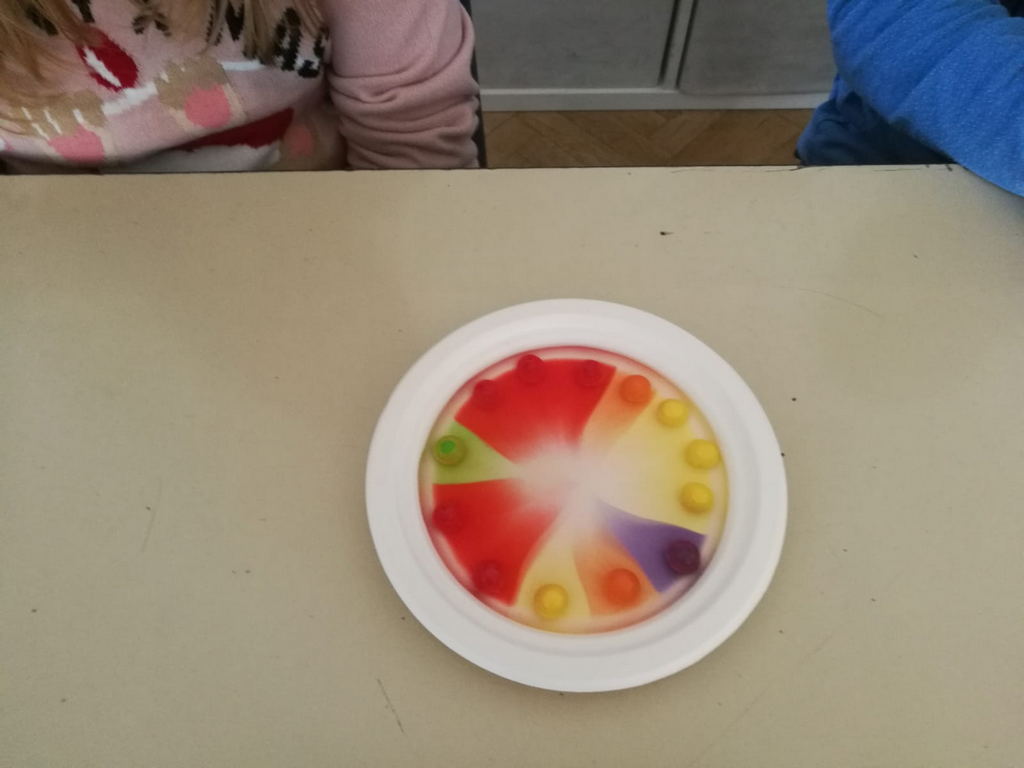 Jedan od eksperimenata je pokus s bombonima. Posložili smo u krug čokoladne bombone i prelili ih vodom. Zadivljeno smo promatrali kako se obojani šećer lako otpušta u dodiru s vodom stvarajući magiju boja.