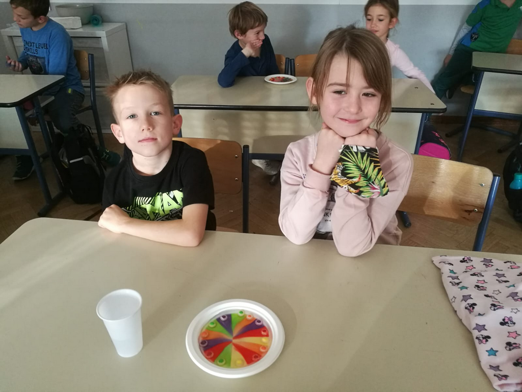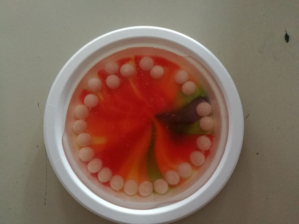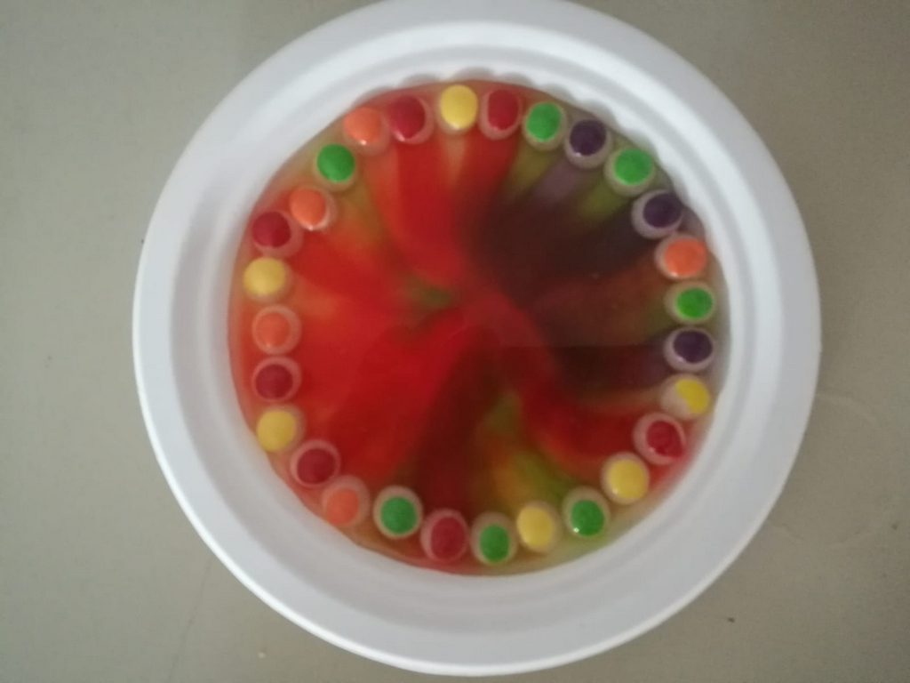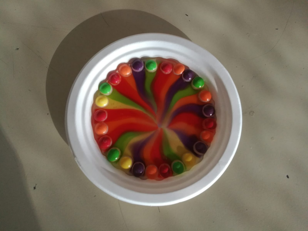 Jedan od eksperimenata je pokus s bombonima. Posložili smo u krug čokoladne bombone i prelili ih vodom. Zadivljeno smo promatrali kako se obojani šećer lako otpušta u dodiru s vodom stvarajući magiju boja.