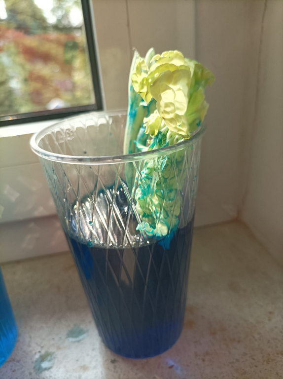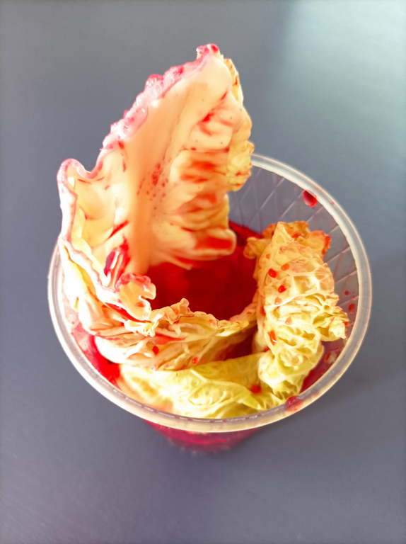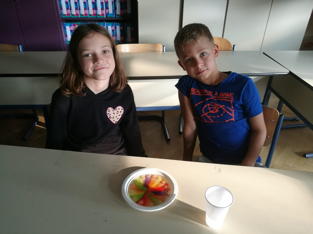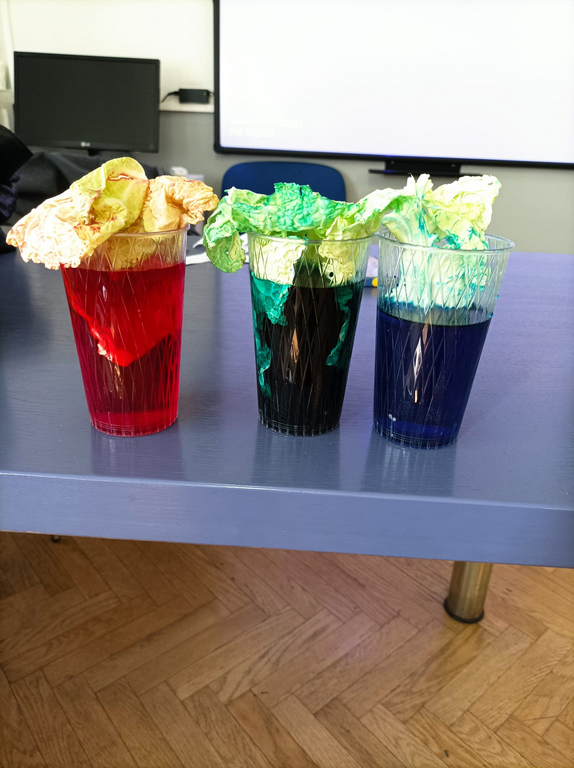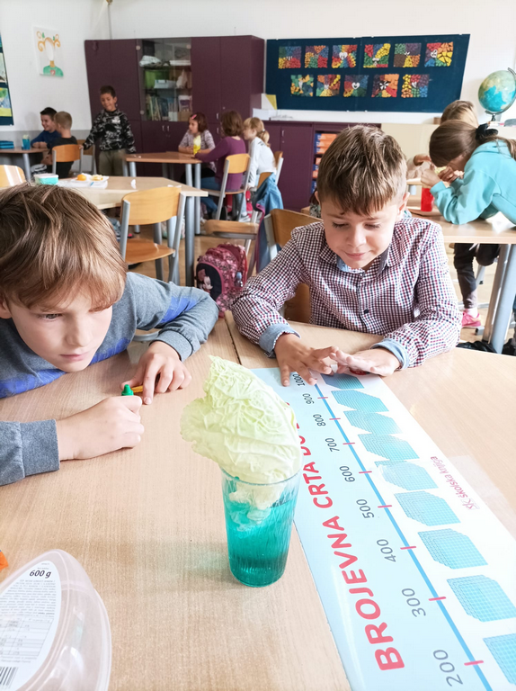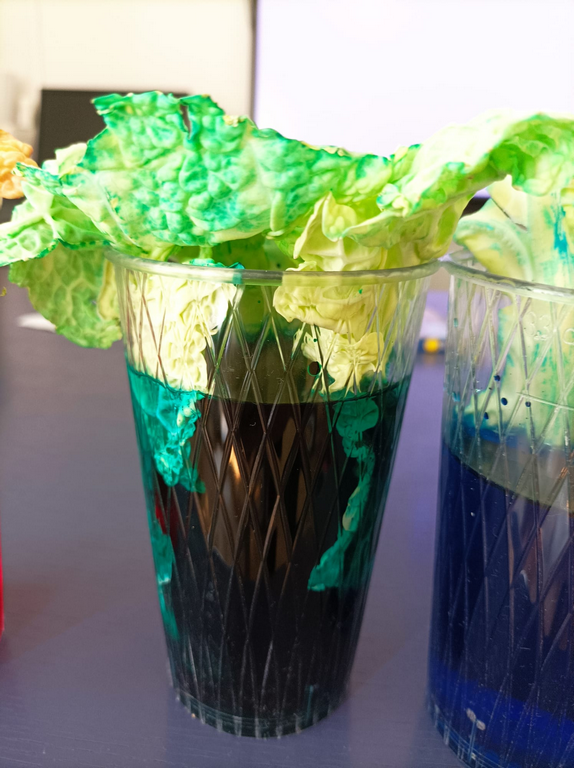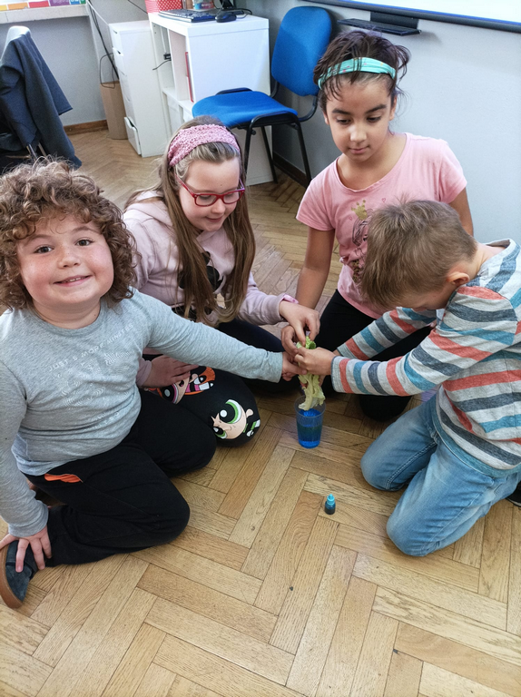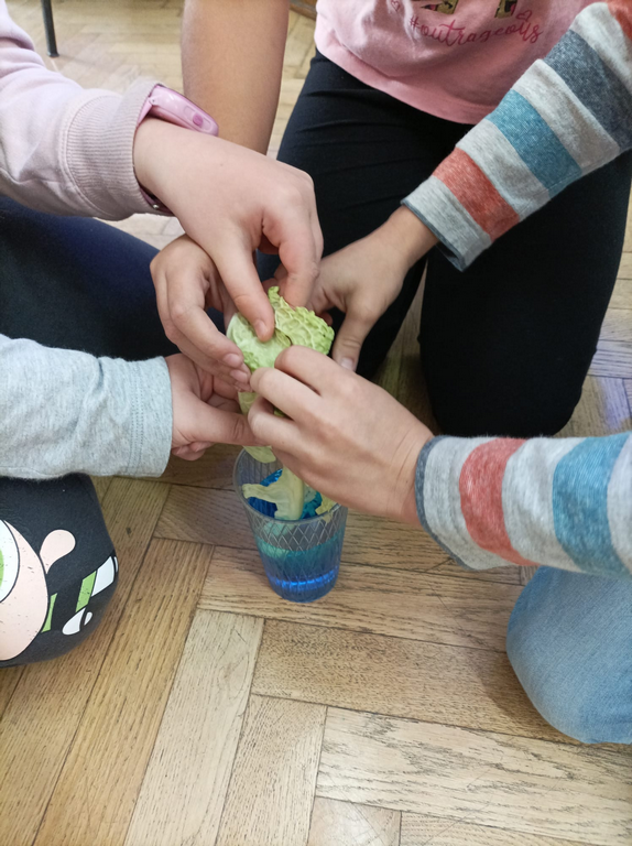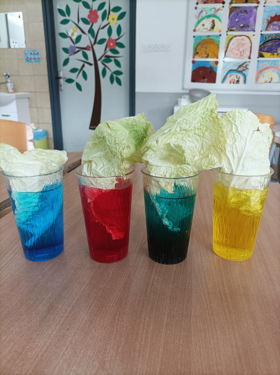 Napravili smo i eksperiment Obojani kupus (kelj). Napunili smo čaše vodom i dodali boje. U svaku čašu smo stavili list kelja i ostavili da stoji preko noći. Sljedeći dan listovi su poprimili boju iz čaše. Kako biljke upijaju vodu, upijaju i boju te vode. Naučili smo da je to kapilarni efekt.