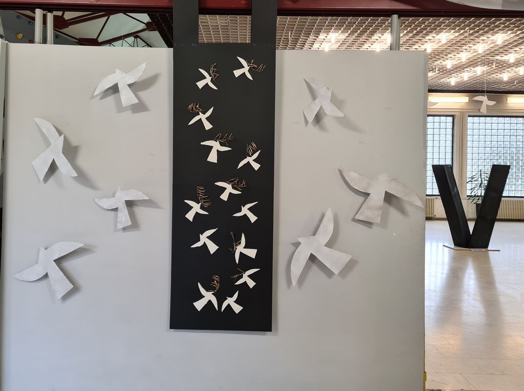 U centralnom predvorju škole velike trodimenzionalno V kao Vukovar poziva na osjećaj zahvalnosti, pijeteta i ponosa prema žrtvama tog grada, dok reljefne bijele grlice (Vukovara i Škabrnje) sa zlatnom maslinovom grančicom u kljunu pronose mir u svijetu. Cijeli izložbeni prostor odiše elegancijom, odmjerenošću, skladom, jednostavnošću i crno – bijelim kontrastom.