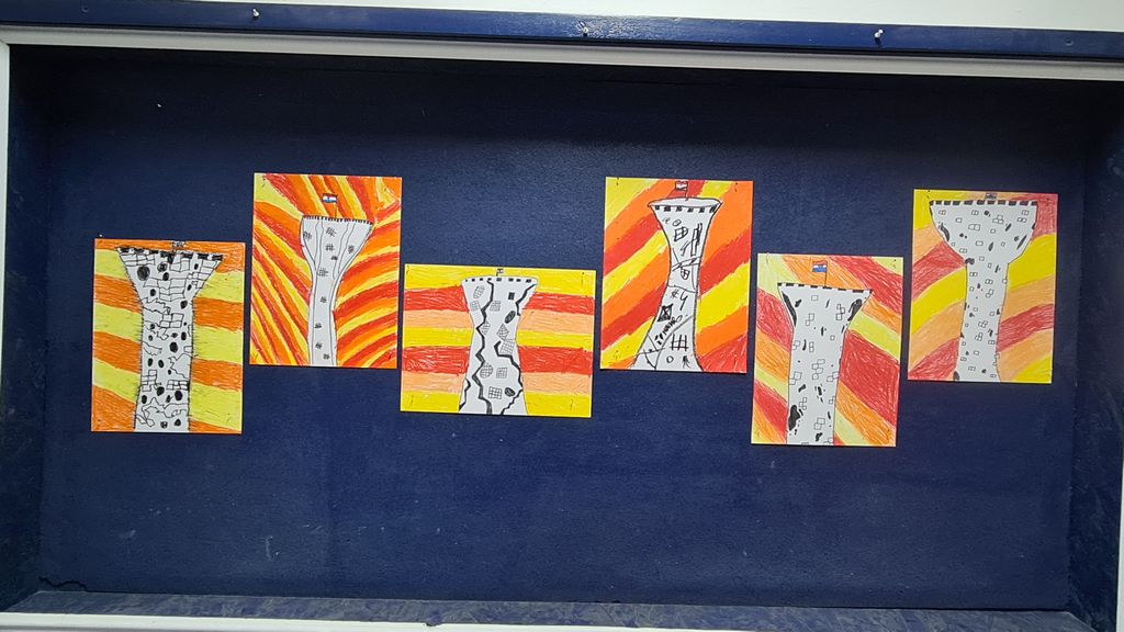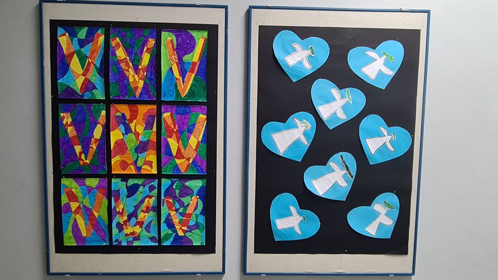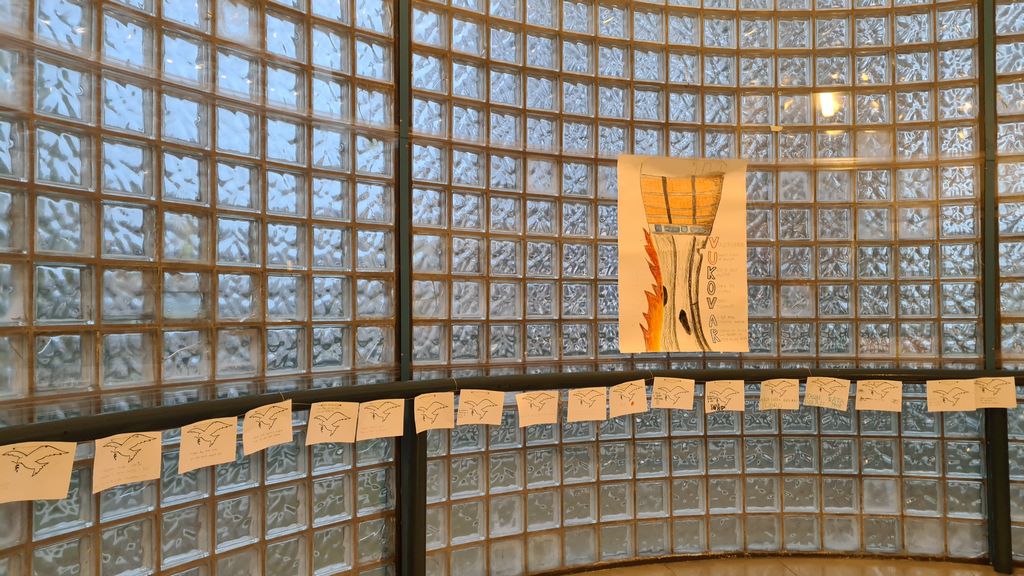 U ostalim izložbenim prostorima škole dominiraju koloristički likovni radovi i plakati učenika s motivima slova V, golubice i vodotornja te stihovi i poruke učenika posvećeni gradu Vukovaru.