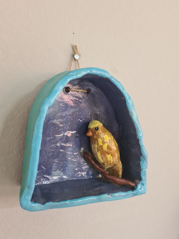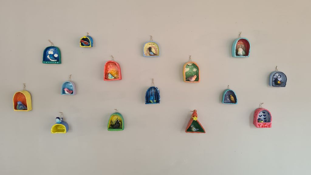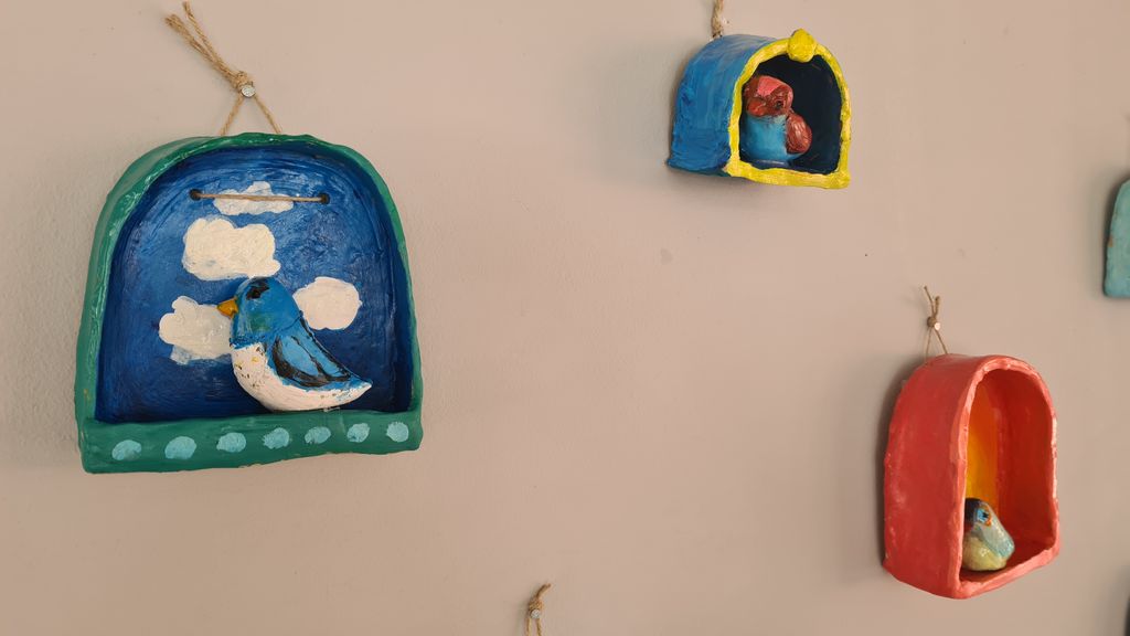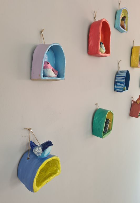 U centralnom izložbenom prostoru dominiraju prava mala remek - djela naših učenika s motivima cvijeća, ptica i pisanica.
