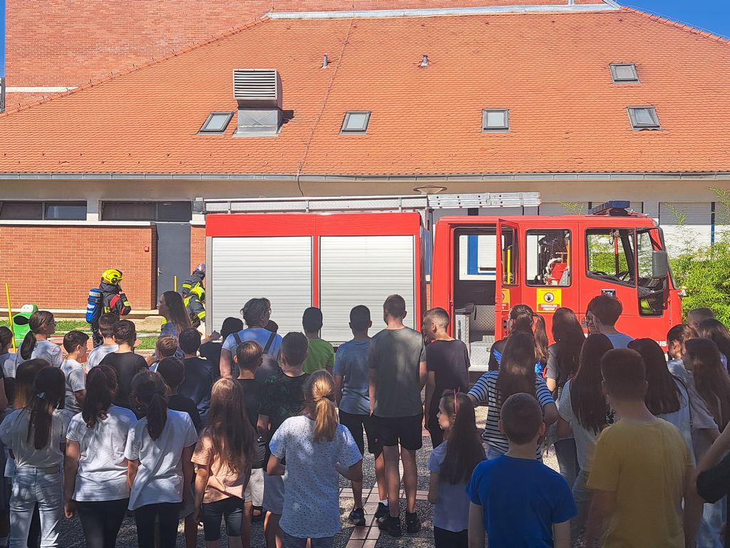 Tamo nas je već dočekalo vatrogasno vozilo i vatrogasci u punoj opremi koji su demonstrirali pokaznu vježbu gašenja požara i pružanja prve pomoći.