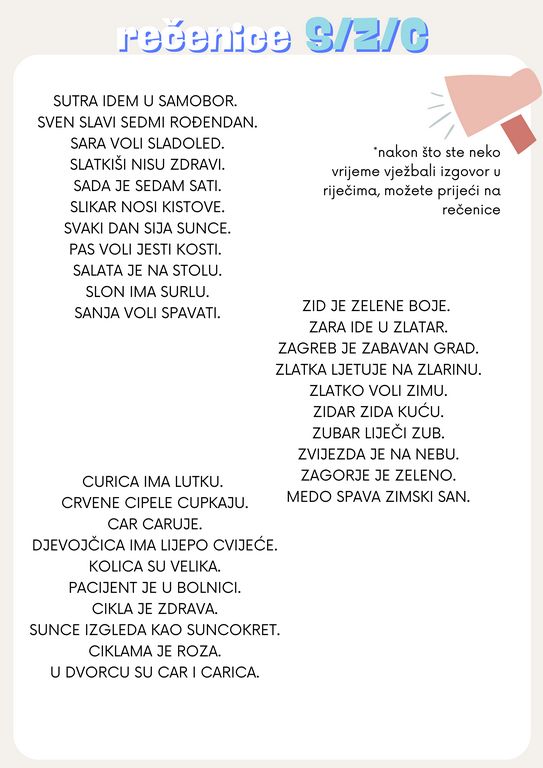 Glasovi mjeseca veljače su glasovi tzv. uže skupine sigmatizma – S, Z i C, a vježbice su u galeriji.