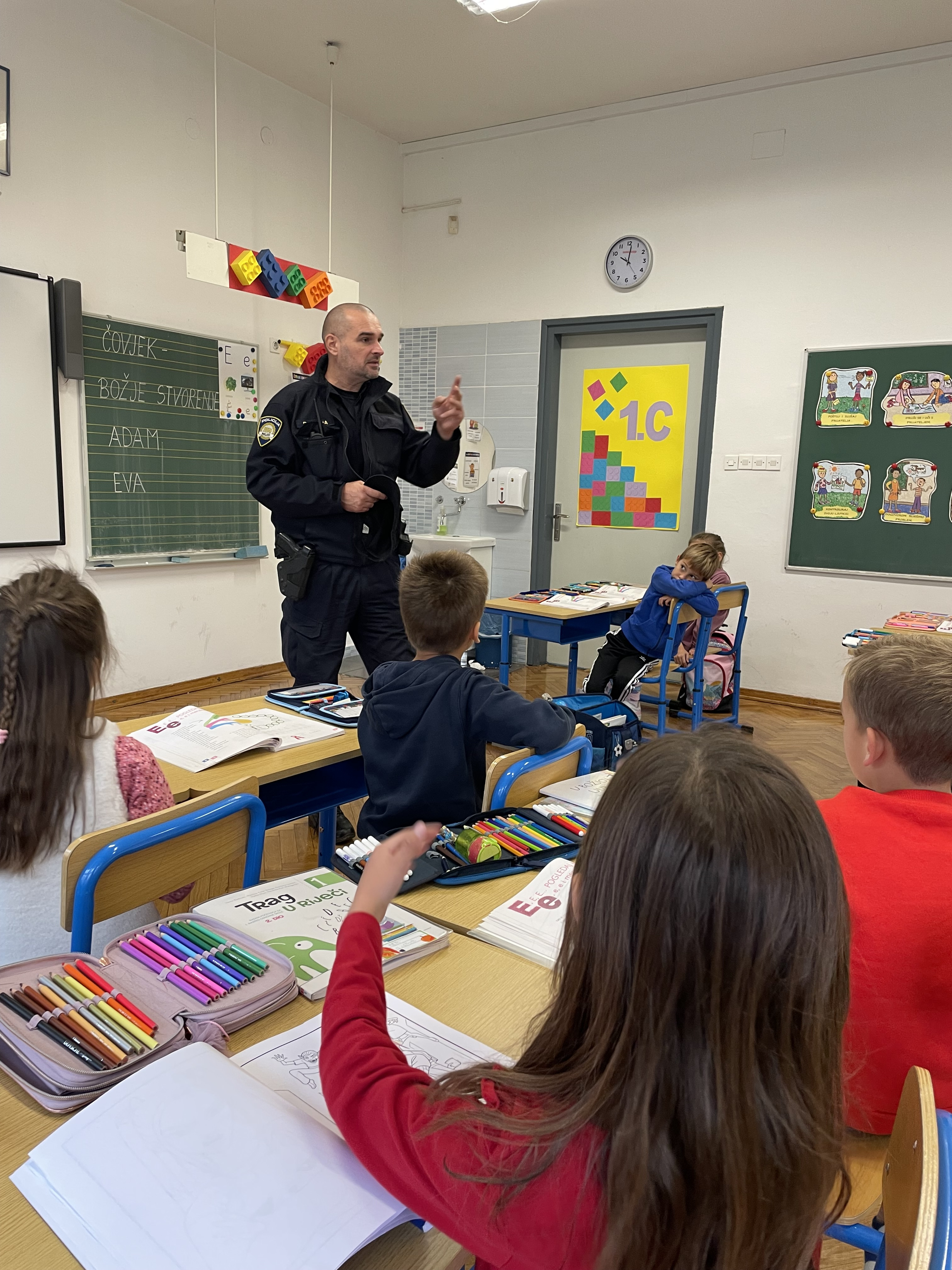 Prvašići su ponovili kako se pravilno prelazi cesta preko zebre, razgovarali su o značenju svjetala na semaforu i zašto uvijek moraju pričekati zeleno svjetlo, čak i ako im se žuri. Poseban naglasak stavljen je na ponašanje biciklista: obavezno nošenje zaštitne kacige, obavezan silazak s bicikla kada se prelazi preko zebre te vožnja po označenim biciklističkim stazama uz pratnju roditelja. Učenici su također razgovarali i o tome koja se pravila trebaju poštovati tijekom vožnje s roditeljima u autu te zašto je bitno da su uvijek vezani pojasom. Policajac je djeci skrenuo pažnju i na opasnosti igre u blizini ceste, posebno u parkovima u blizini prometnica.